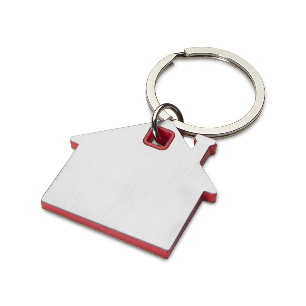 Брелок для ключей в форме домика с цветной вставкой из пластика между 2-мя серебристыми пластинами из стали.