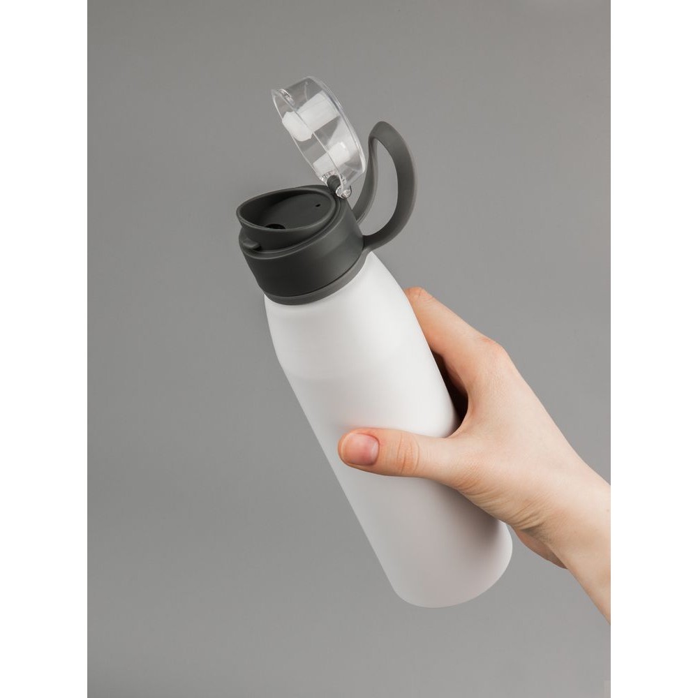 Легкая бутылка для спорта с откидной крышкой и силиконовой петлей для удобной транспортировки.