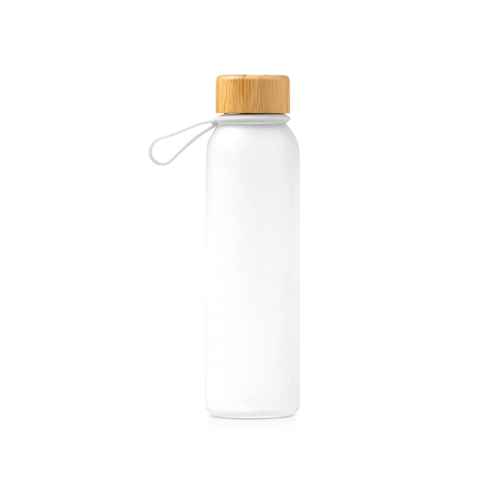 Полупрозрачная бутылка из переработанного стекла. Бамбуковая крышка с держателем. Объём: 500 мл. Поставляется в индивидуальной коробке.