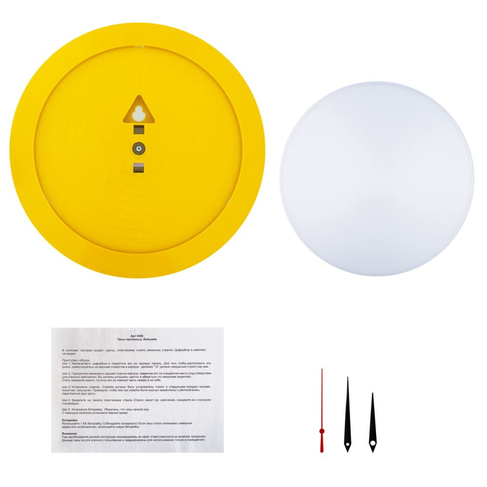 Часы поставляются в разобранном виде: корпус, крышка, стрелки, механизм и индивидуальная упаковка — коробка. Часовая и минутная стрелки — черного цвета, секундная — красного цвета.