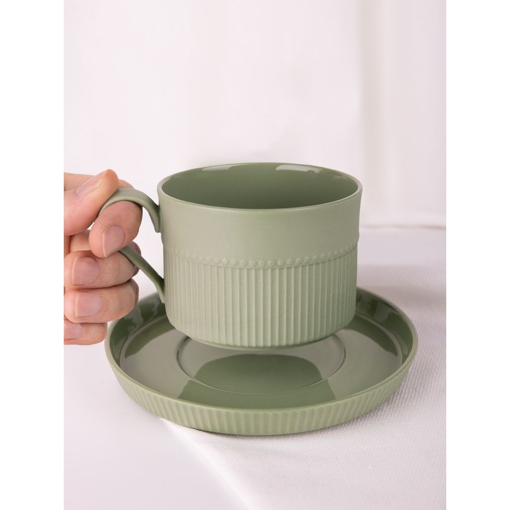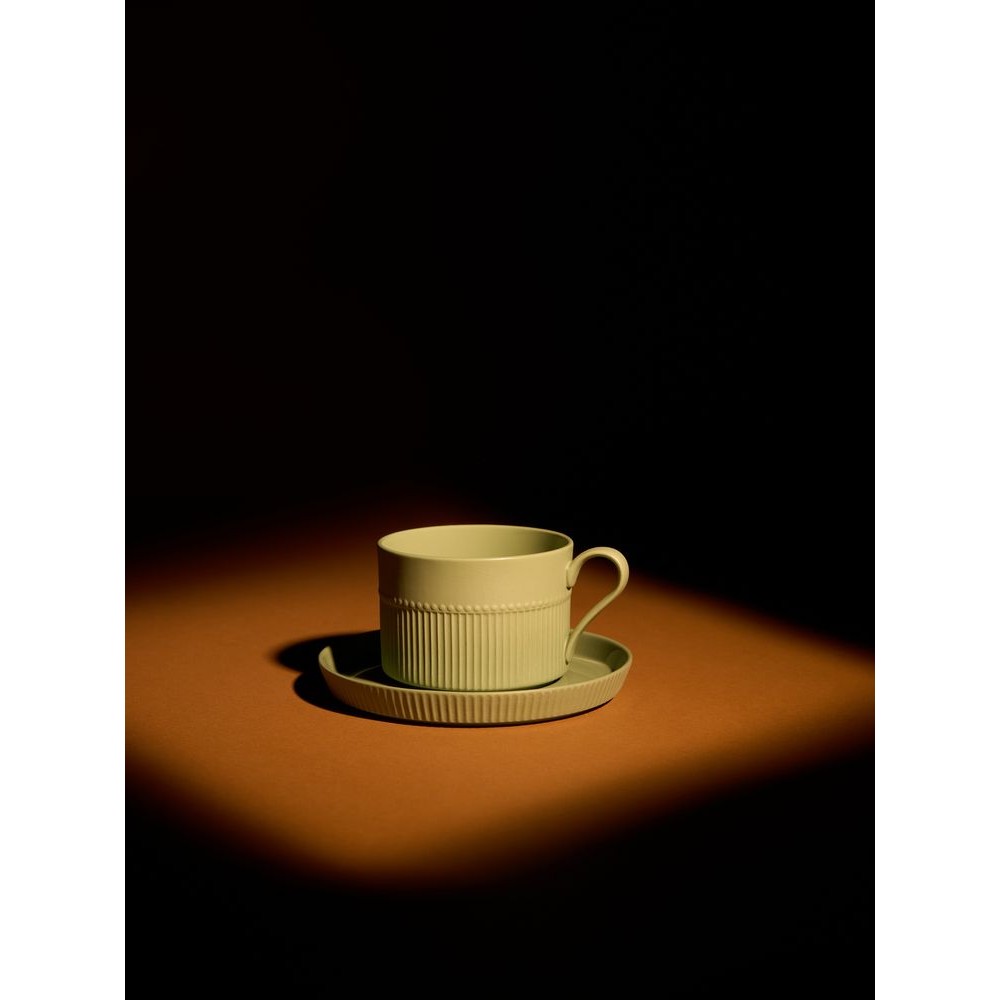 Орнамент корпуса кружки и высокого бортика блюдца напоминает изящные каннелюры — вертикальные желобки на колонне. Это добавляет всему изделию изысканности и стилистической завершенности, благородства и античной строгости.