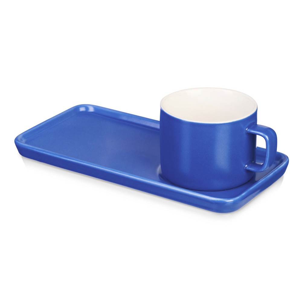 Чайная пара с необычным прямоугольным блюдцем — на нем хватит места не только для чашки, но и для пирожного. Весь силуэт этого комплекта — лаконичный, строгий, прямоугольный, что создает прекрасный фон для нанесения логотипа. Удобство этой чайной пары еще и в том, что для чашки предусмотрена отдельная ниша, которая не даст ей соскользнуть.