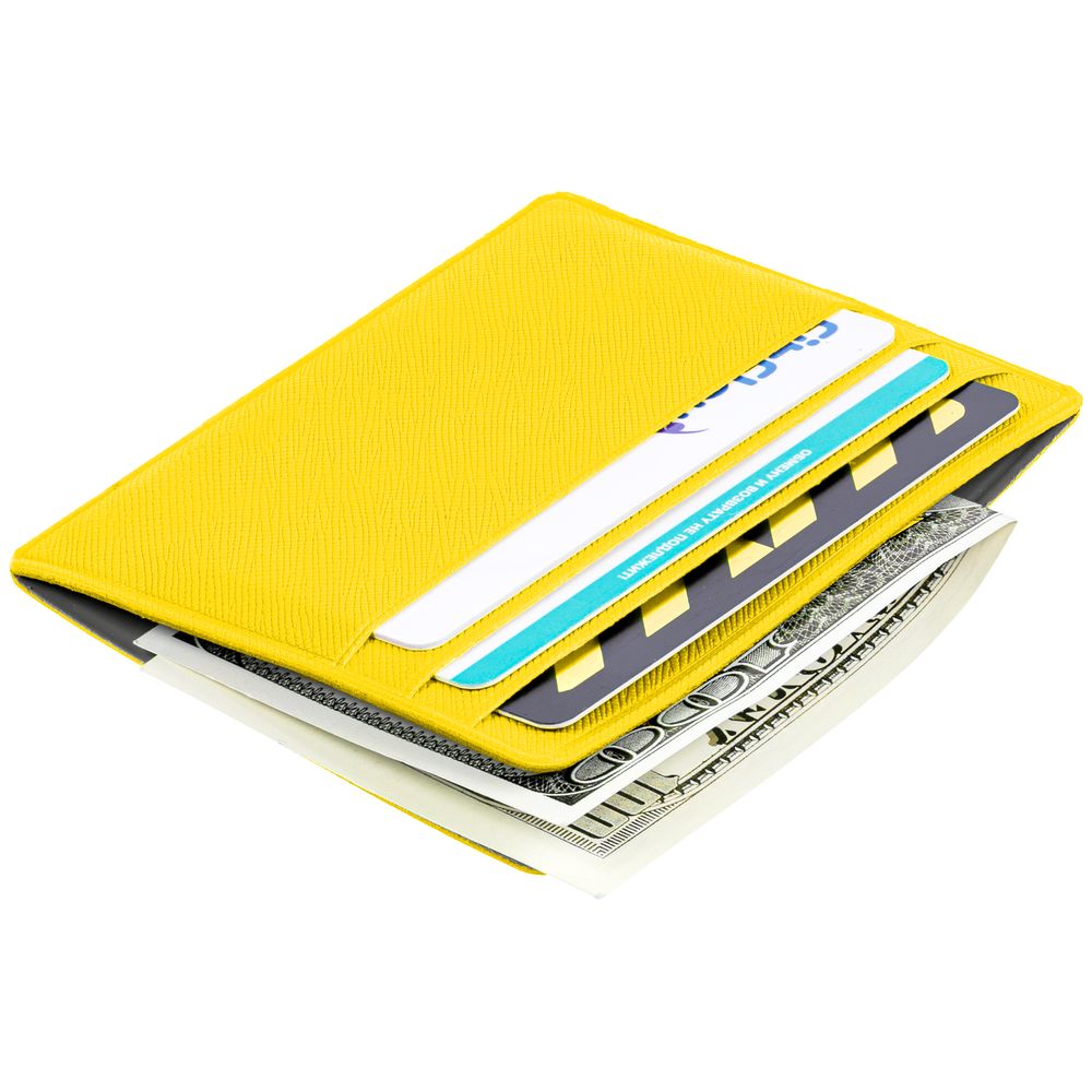 Чехол для карточек из искусственного материала, имитирующего сафьяновую кожу, с шестью отделениями для кредитных карт и одним — для сложенных купюр.