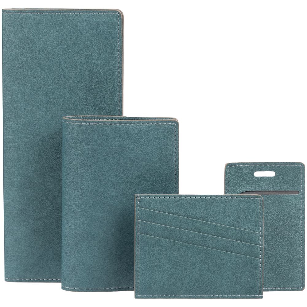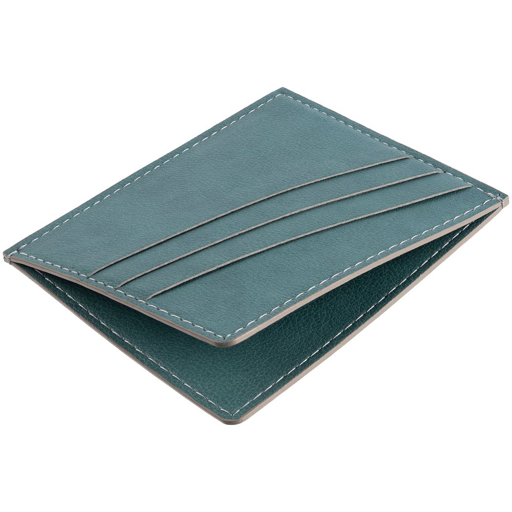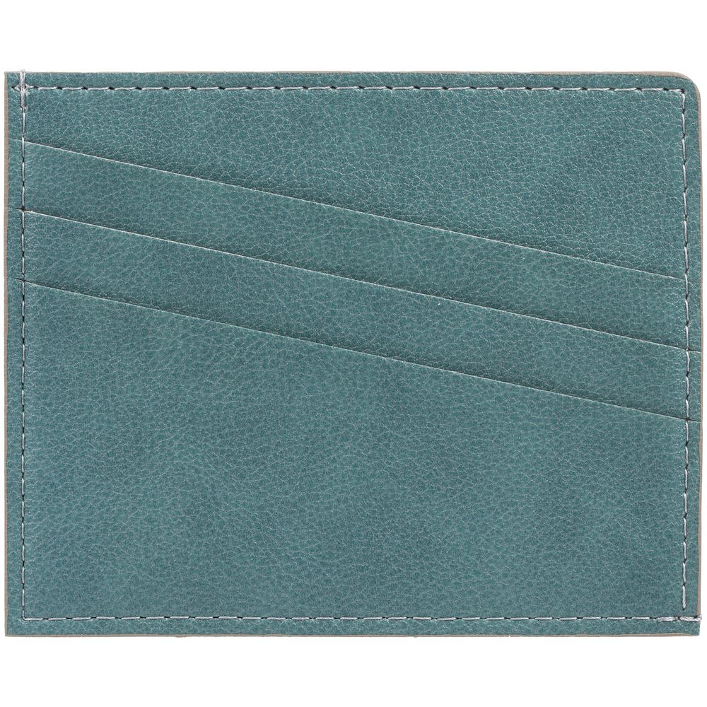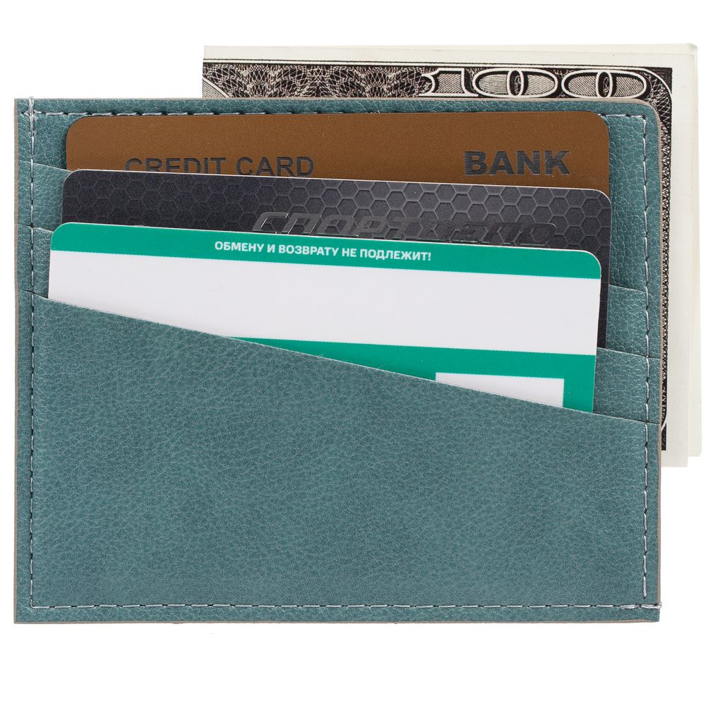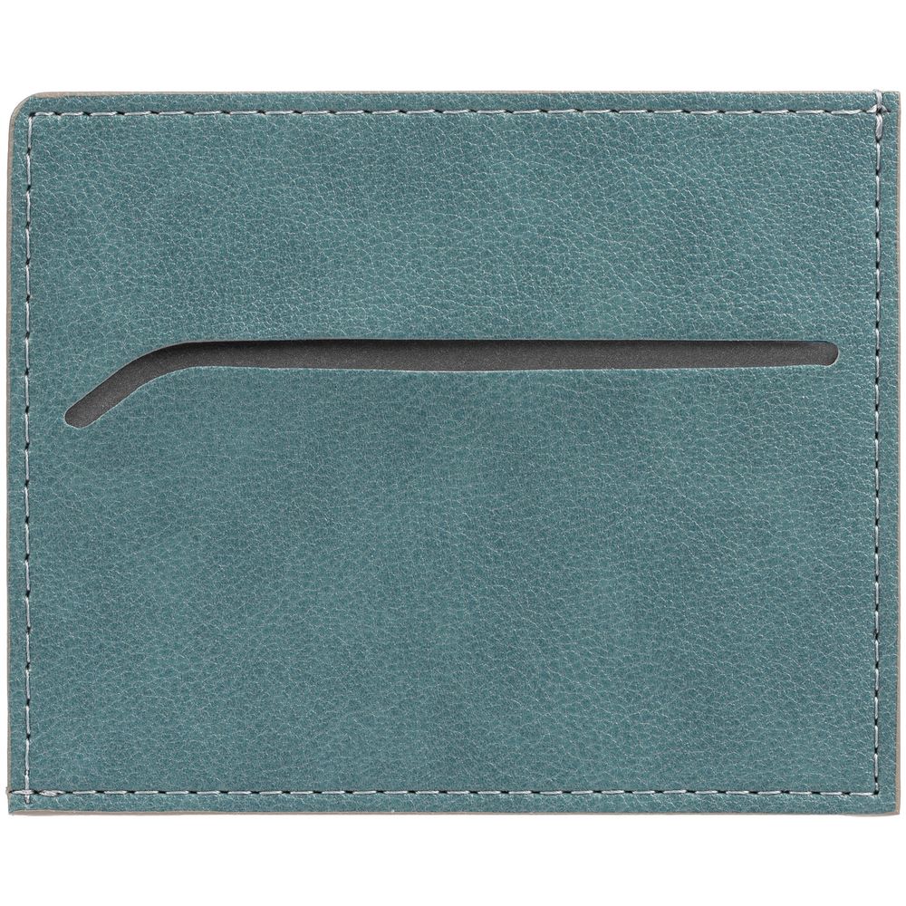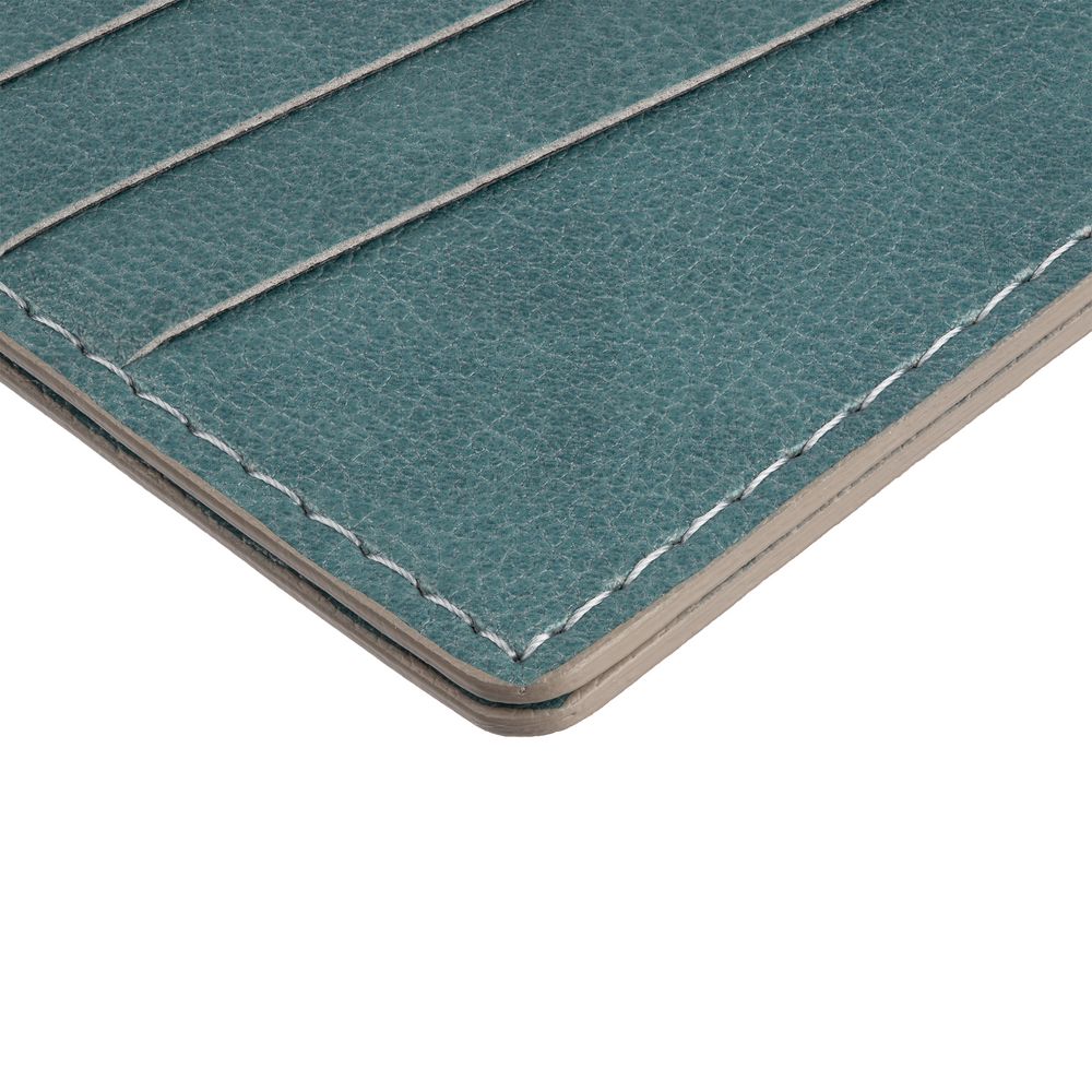 Чехол выполнен из материала Petrus, голубой JJ, дополнен окрашенным срезом края и внутренним карманом из серого картона. Имеет 4 отделения для кредитных карт и 1 отделение для купюр.