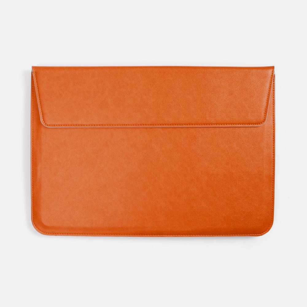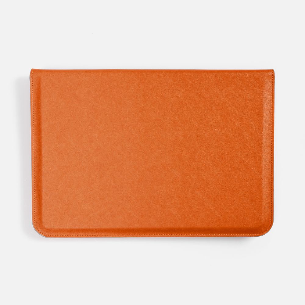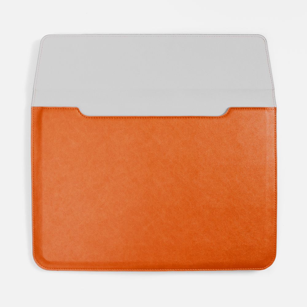 Чехол для ноутбука с диагональю до 15,6 выполнен из материала Petrus, оранжевого цвета, дополнен окрашенным срезом края серого цвета.