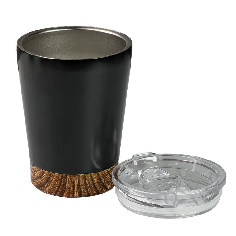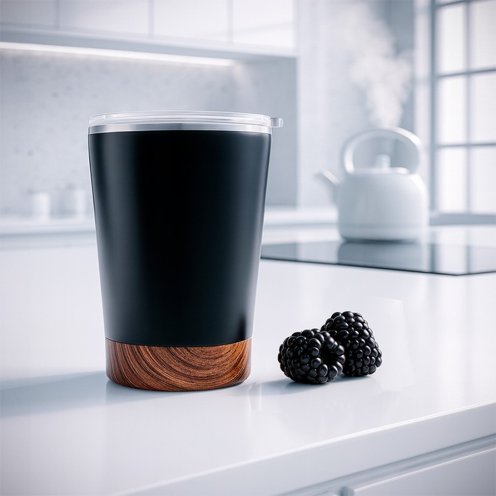 Стильная термокружка с черным матовым корпусом и декоративной вставкой с имитацией фактуры дерева soft-touch.