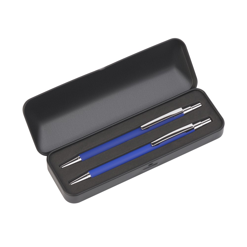 Металлическая ручка и карандаш с корпусом в покрытии soft touch в металлическом серебристом футляре.