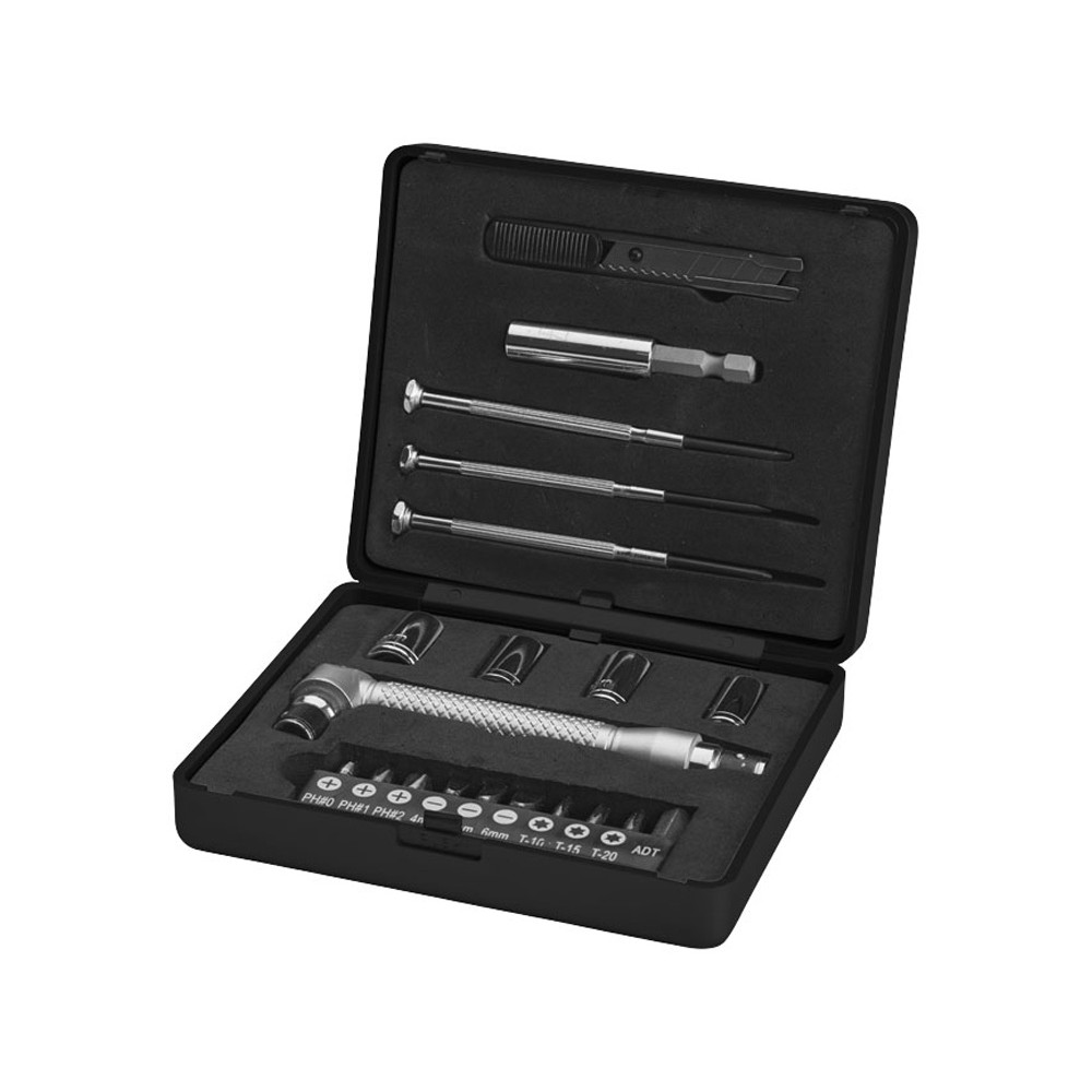 Набор из 20 инструментов в маленькой коробочке. В комплекте три отвертки, 10 насадок в холдере: три размера Philips (PH0, PH1, PH2) три плоских (4,5,6 мм), три звездочкой (Т10, Т15, Т20) и 1 адаптер; четыре ключа ( 7, 8, 9, 10 мм), один ножик, ручка и коннектор. Упакован в коробку STAC. АБС пластик.