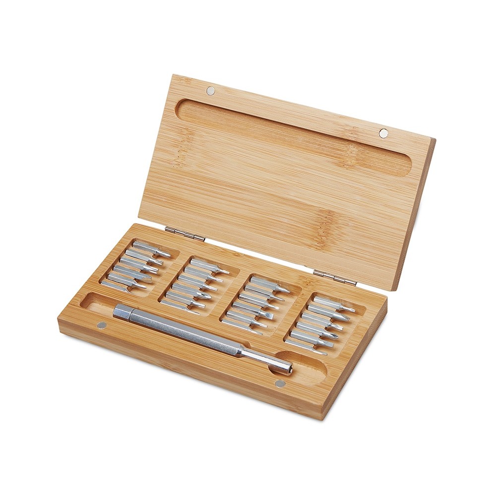 Стильный и практичный набор отверток в элегантном корпусе из натурального бамбука. Компактный кейс закрывается на магниты, а верхняя крышка отмечена круглым красным стикером для удобной идентификации. Внутри — отвертка и 24 наиболее востребованные биты: крестовые, плоские и звездочки, которые подойдут для решения большинства бытовых и профессиональных задач. Набор выполнен из экологичных материалов — прочной стали и натурального бамбука. Классическая прямоугольная форма без выступающих деталей делает его особенно удобным для персонализации и нанесения логотипа.