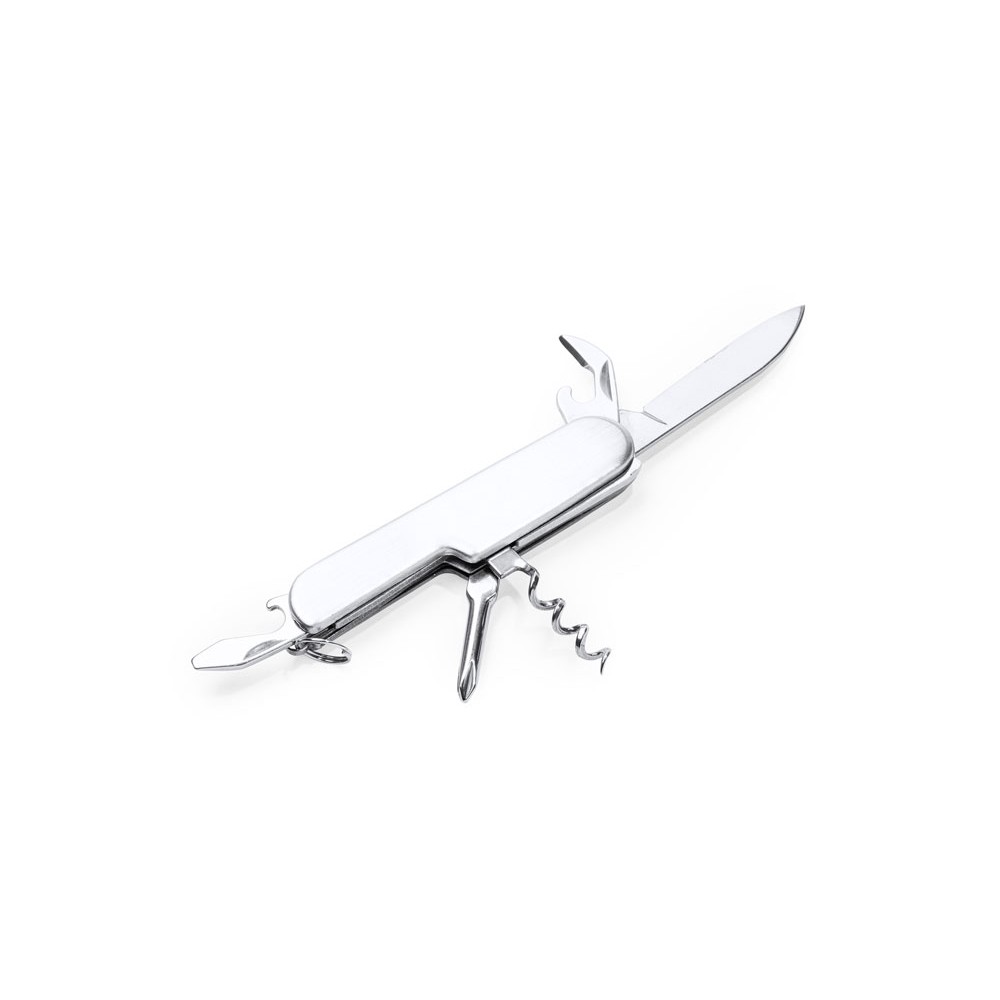 Мультифункциональный нож из нержавеющей стали с 6 функциями: нож, открывалка для бутылок, консервный нож, штопор, отвертка и кольцо для ключей.