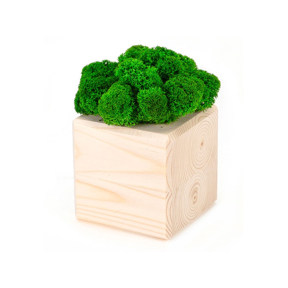 Изделие состоит из стабилизированного мха ягеля, деревянного куба и деревянного упаковочного каркаса. Отталкивает пыль и придает интерьеру индивидуальность. Размер изделия 8х8х13 см.