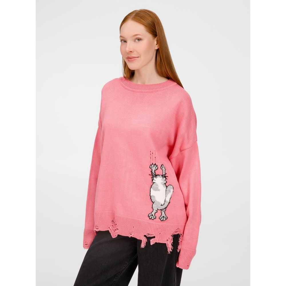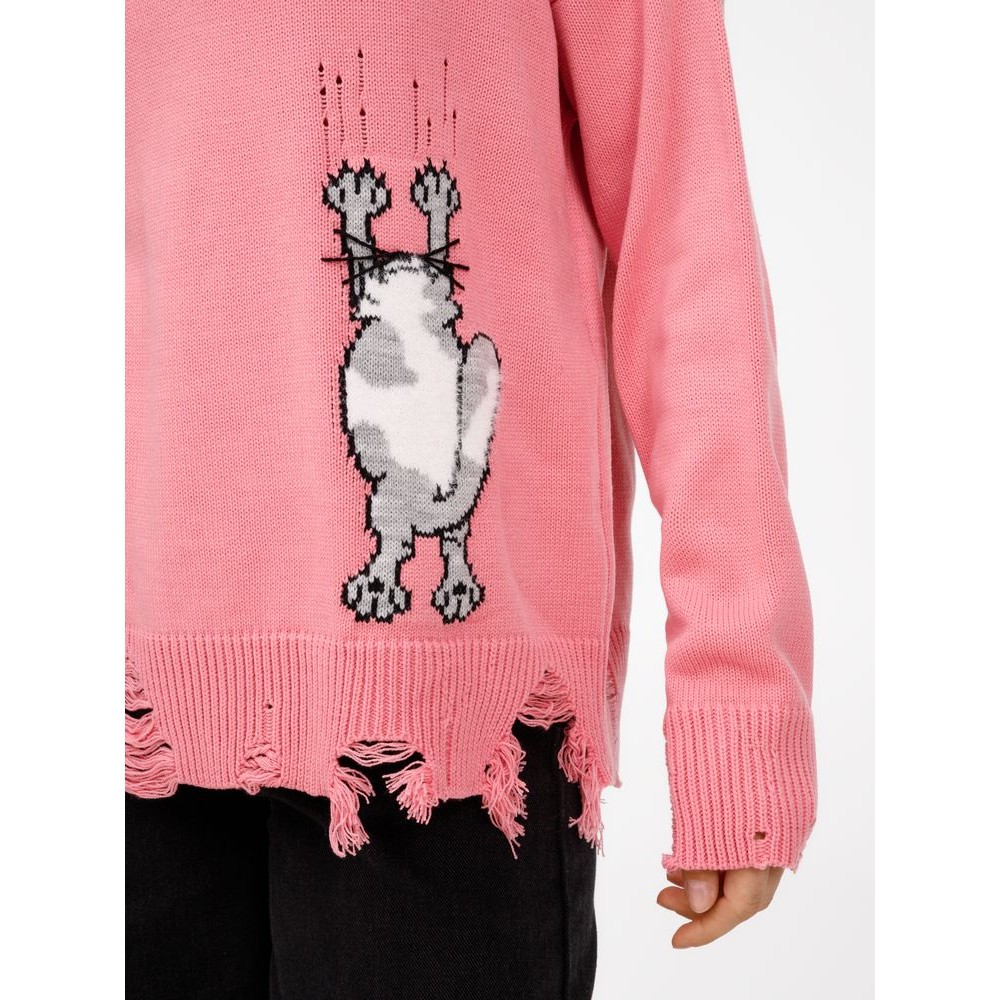 В дизайне мягкого джемпера с круглым вырезом Sharpick гранж-эстетика органично сочетается с милым акцентом — пушистым рисунком в виде озорного котика. Получается веселая вариация на тему того, откуда берется модная рваная одежда, а джемпер моментально создает настроение легкой несерьезности. Рваные края изделия добавляют современную нотку, а резинка на вороте, манжетах и по низу обеспечивает удобную посадку.