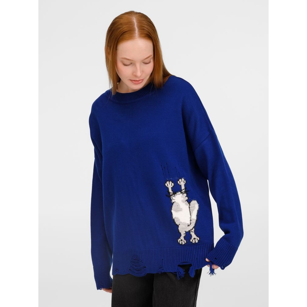 В дизайне мягкого джемпера с круглым вырезом Sharpick гранж-эстетика органично сочетается с милым акцентом — пушистым рисунком в виде озорного котика. Получается веселая вариация на тему того, откуда берется модная рваная одежда, а джемпер моментально создает настроение легкой несерьезности. Рваные края изделия добавляют современную нотку, а резинка на вороте, манжетах и по низу обеспечивает удобную посадку.