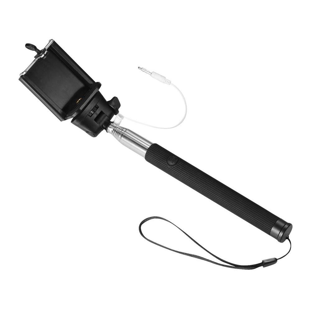 Проводной монопод. Сделайте идеальный селфи с этим выдвижным моноподом (до 90 см). Не требует батареи или использования приложения. Просто подключите 3,5 мм аудио разъем в телефон (совместим только с телефонами, у которых есть разъем 3.5 мм) и нажмите на кнопку, расположенную на ручке. Регулируемый держатель. Силикон, сталь и ПВХ.
