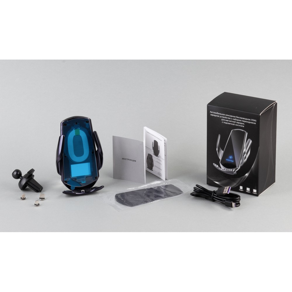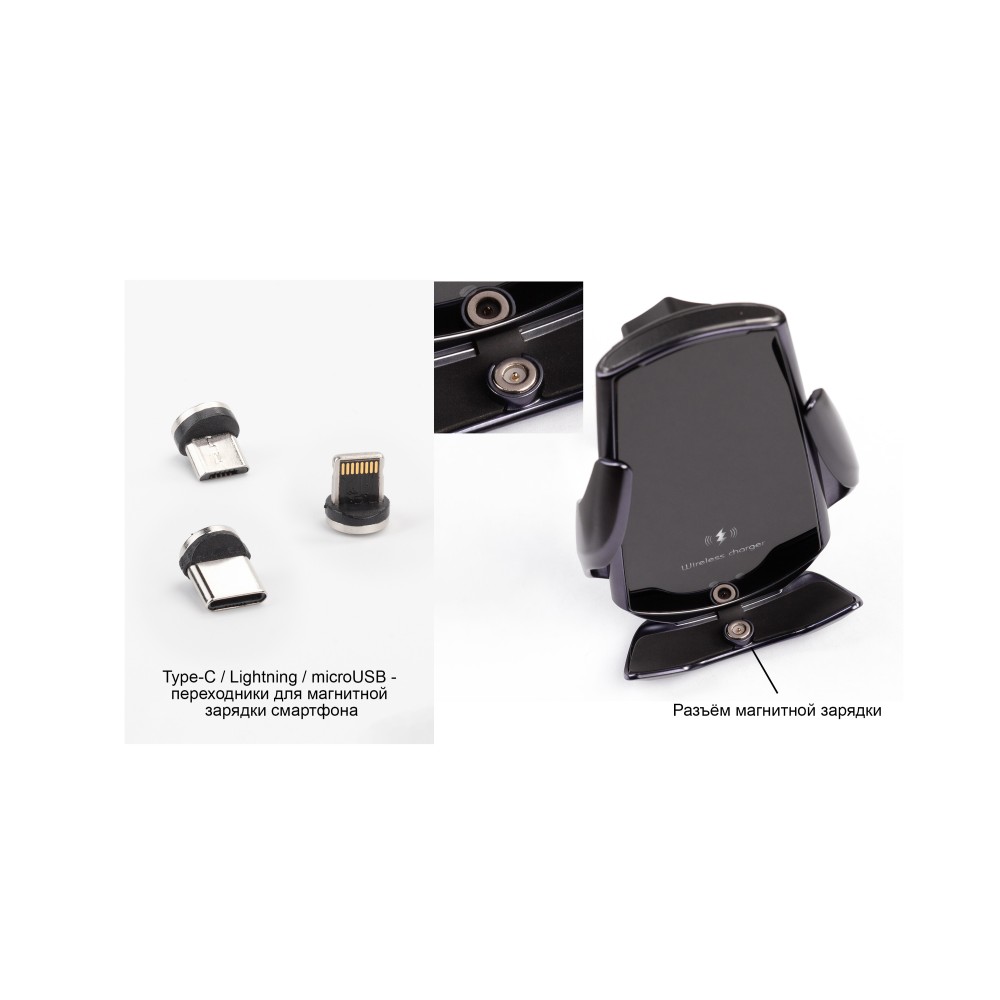 Набор переходников и разъём в нижней подставке устройства позволяют заряжать беспроводным (магнитным) способом любые смартфоны вне зависимости есть у них функция беспроводной зарядки или нет. Нужно просто вставить в зарядный разъём Вашего смартфона подходящий переходник - Type-C, Lightning или MicroUSB - и при установке смартфона в устройство зарядка начнётся автоматически.