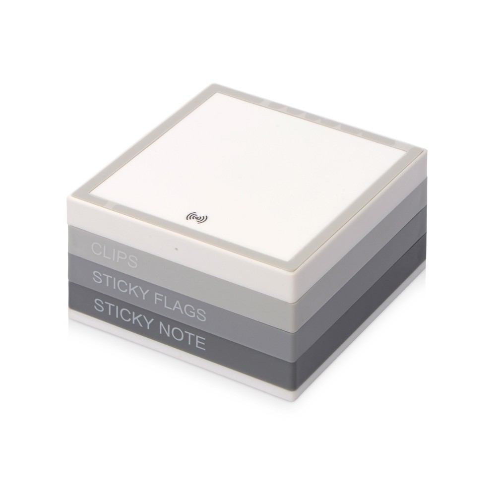 Органайзер Chaos с функцией беспроводной зарядки – современный бизнес-подарок, объединяющий в себе функциональность и современный подход к организации рабочего пространства. Три выдвигающиеся подставки уже содержат скрепки, самоклеящиеся стикеры и стикеры-закладки. Органайзер подходит для беспроводной зарядки и хранения смартфона, поддерживающего функцию беспроводной зарядки, и различных канцелярских аксессуаров. Работает от кабеля Micro-USB. В комплект входит кабель Micro-USB.