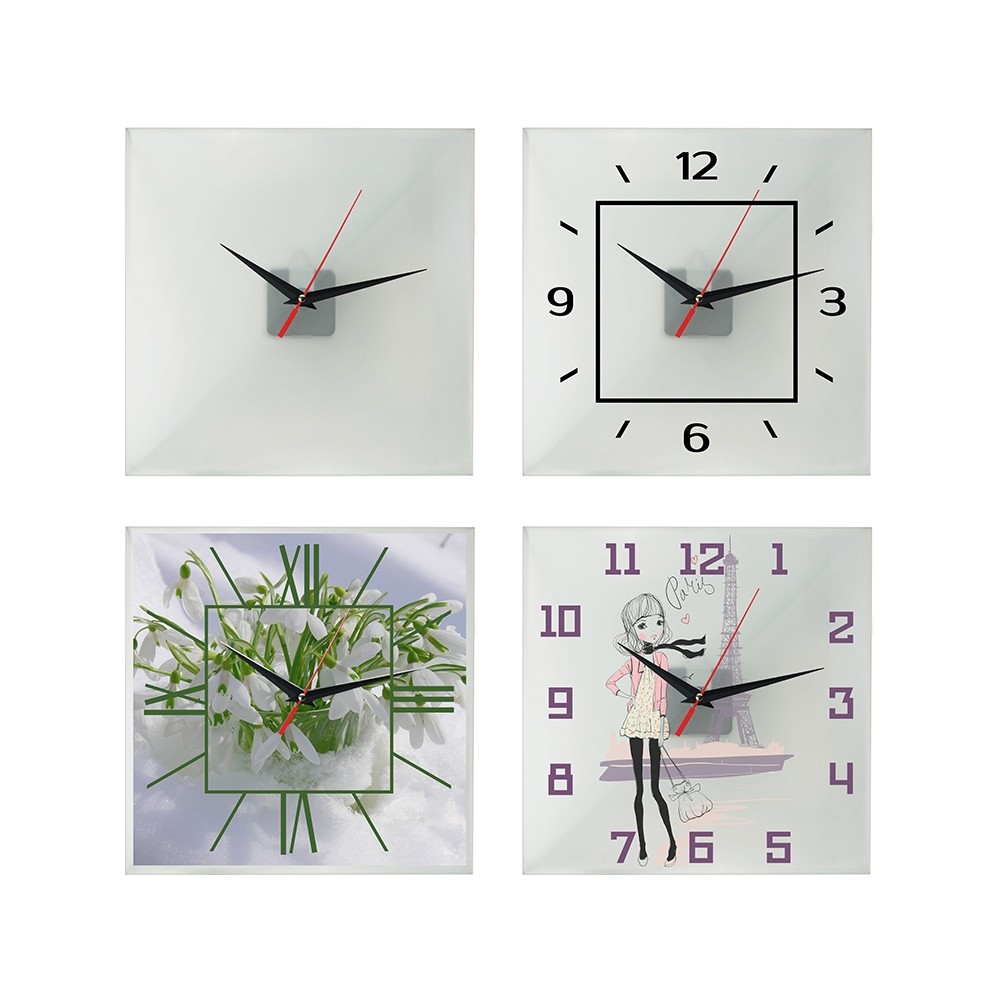 Часы предназначены для нанесения циферблата на стекло по индивидуальному дизайну с помощью технологии цифрового термотрансфера: на оборотную сторону циферблата заводским способом нанесена специальная пленка. Изображение печатают на обычной глянцевой бумаге, а затем закрепляют на циферблате термопрессом — пленка плавится, и бумага с печатью плотно припаивается к стеклу. Часы поставляются без батареек.