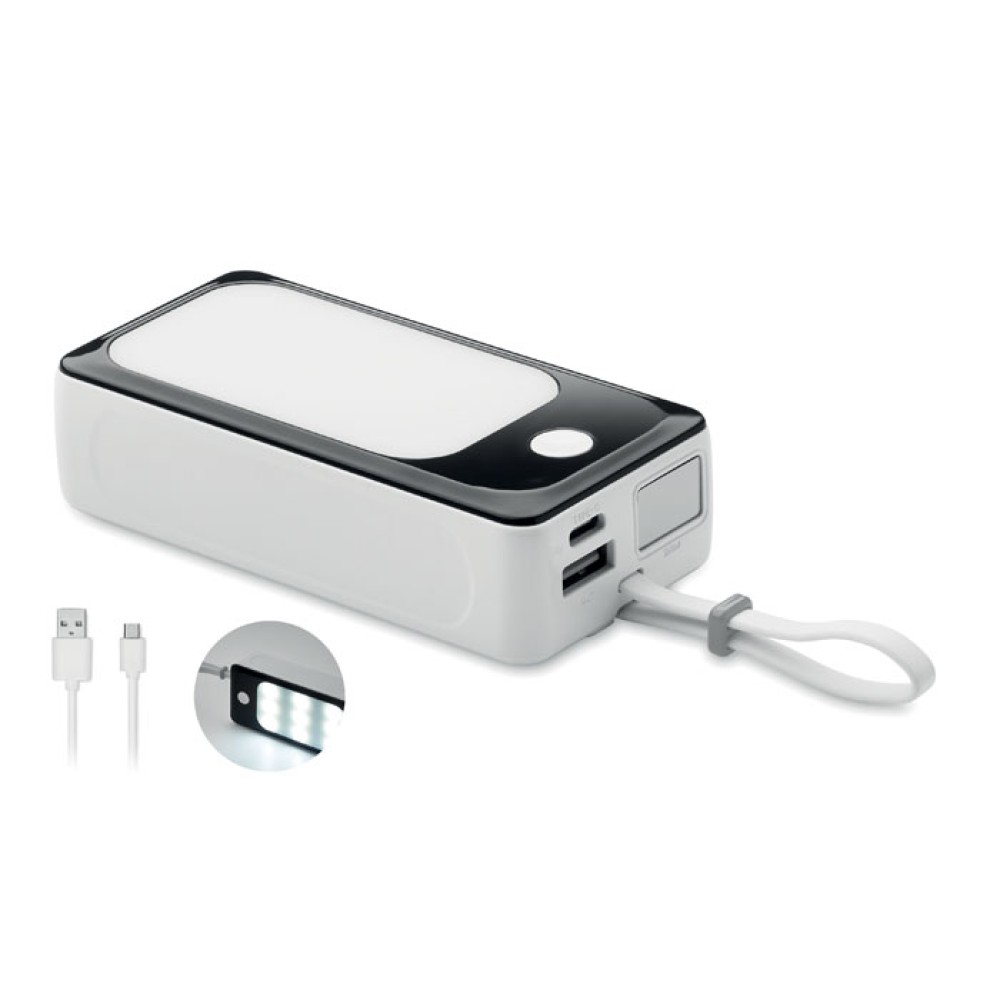 Аккумулятор емкостью 10000 мАч в пластиковом корпусе. Выход DC5V/2A. В комплекте 4 световых индикатора (6 COB-светодиодов) и встроенный USB-кабель с разъемом Type C. 22,5 Вт с индикацией заряда батареи.