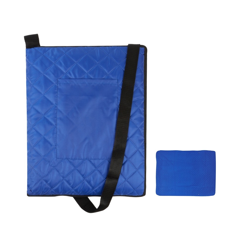 Двухсторонний плед с водоотталкивающим покрытием с одной стороны и мягким флисом с другой. Складывается в сумку на плечо и фиксируется с помощью молнии. В собранном виде имеет регулируемый по длине ремень для переноски и наружный карман для мелочей.