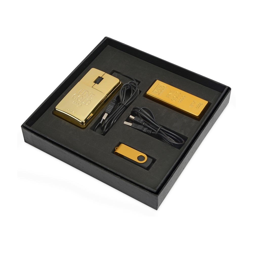 Набор компьютерных аксессуаров, в который входят: компьютерная мышка, USB Hub на 4 порта, изготовленные в виде золотых слитков, а также флеш-карта USB 2.0 на 8 Gb и кабель mini-USB. Это отличный подарок со смыслом, ведь золотой слиток – это символ богатства и роскоши!