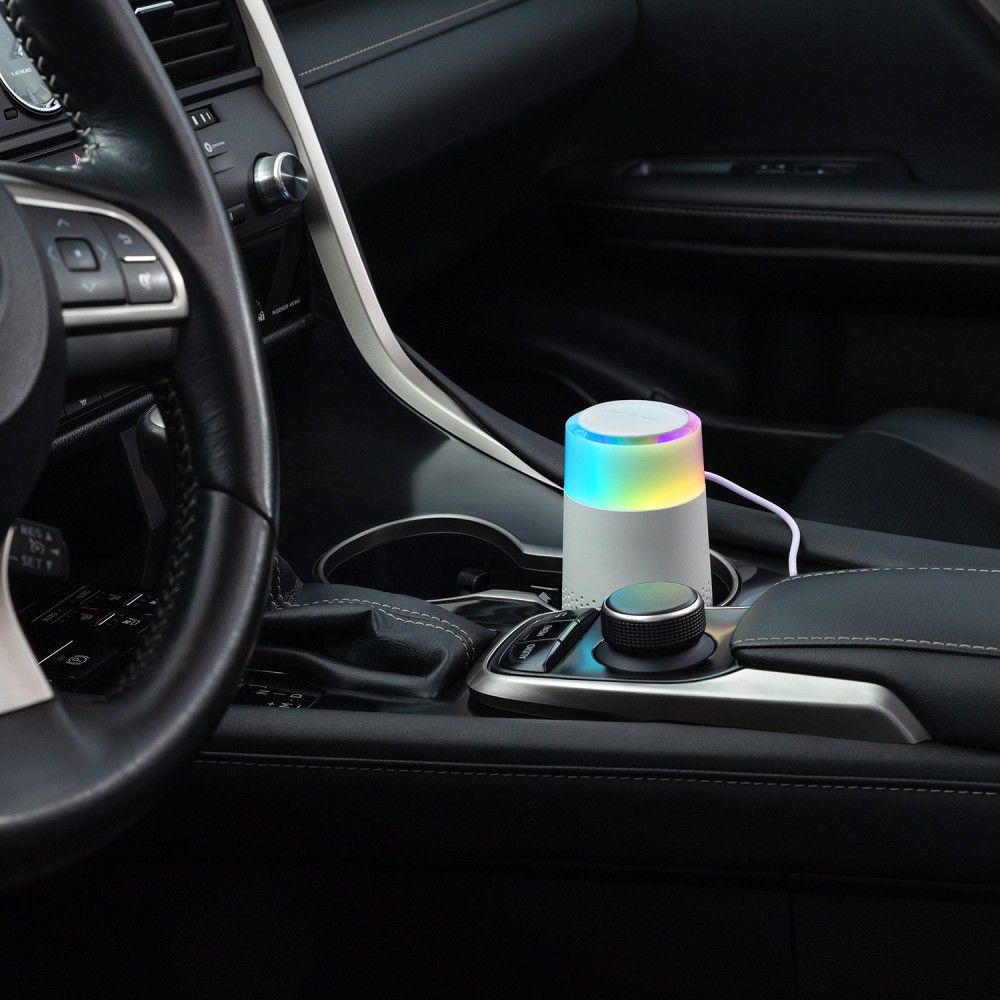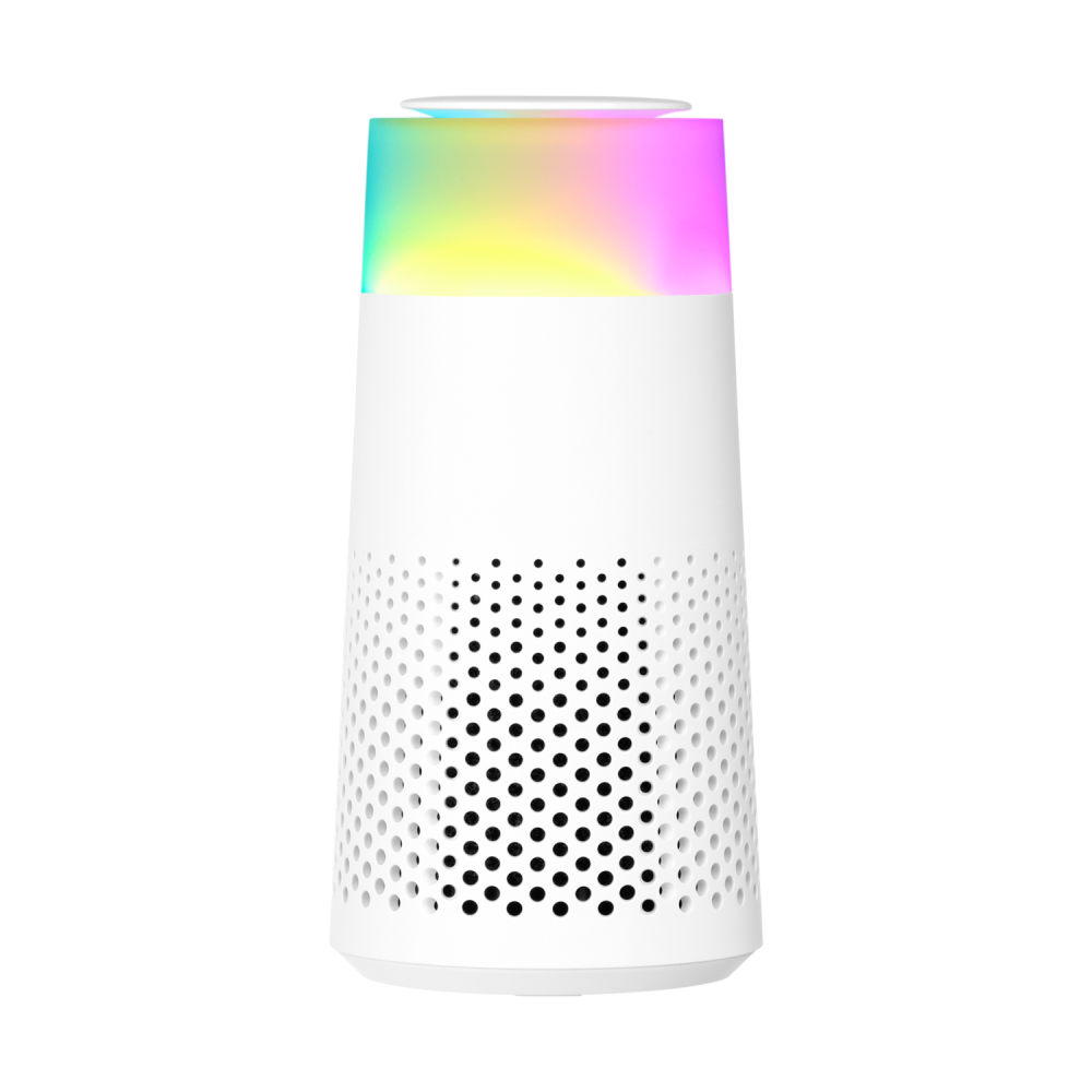 Мини-очиститель воздуха с радужной LED-подсветкой. Высококачественный фильтр с тройной системой фильтрации в сочетании с высокоскоростным вентилятором очищают воздух, поглощая и фильтруя различные загрязнители через гладкую аэродинамическую трубу. Освежение воздуха за несколько минут.