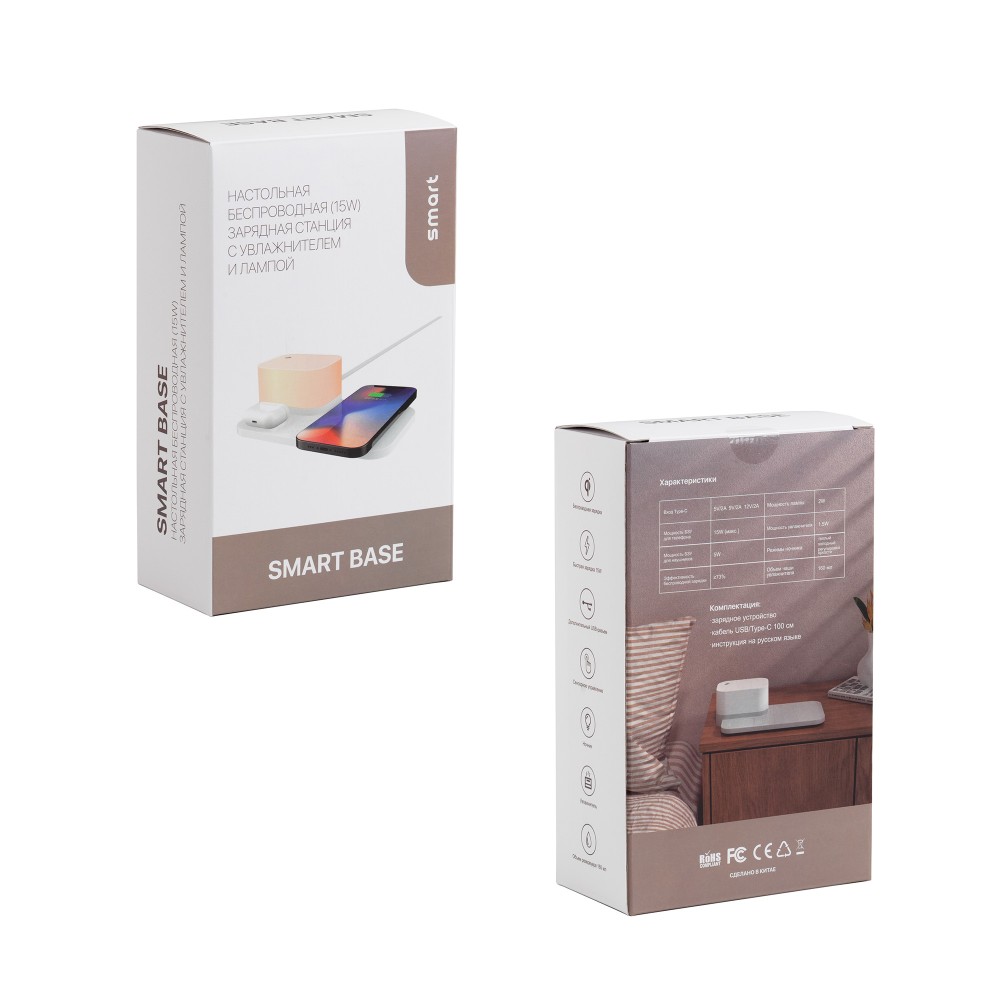 Smart Base сочетает популярные функции: зарядка, подсветка и увлажнитель. Рекомендуется подключение через сетевой адаптер номиналом не менее 5V/2A, чтобы в полной мере использовать характеристики устройства. Лампа работает в трех режимах - теплый, холодный и сбалансированный свет, яркость можно регулировать. Два режима работы увлажнителя 8 мл/час и 16 мл/час.