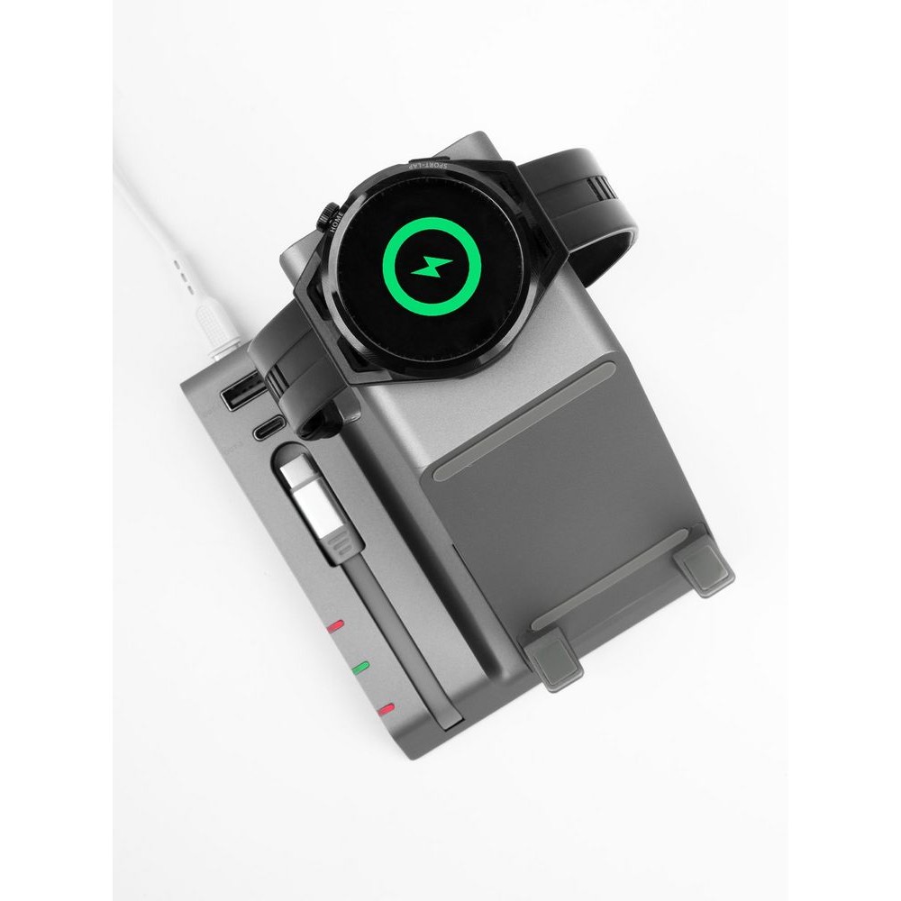 Зарядная станция Tres высшего уровня сложности позволяет заряжать до 5 гаджетов одновременно: телефон, часы Apple Watch 2–8, наушники с поддержкой протокола беспроводной зарядки Quick Charge и еще 2 устройства через кабели с разъемами USB-А и Type-C.