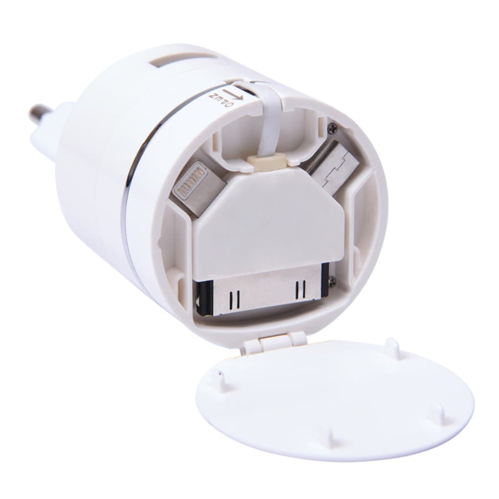 Сетевое зарядное устройство для подзарядки мобильных устройств. Имеет стандартный выход USB, а также встроенный универсальный кабель с возможностью зарядки различных устройств.
