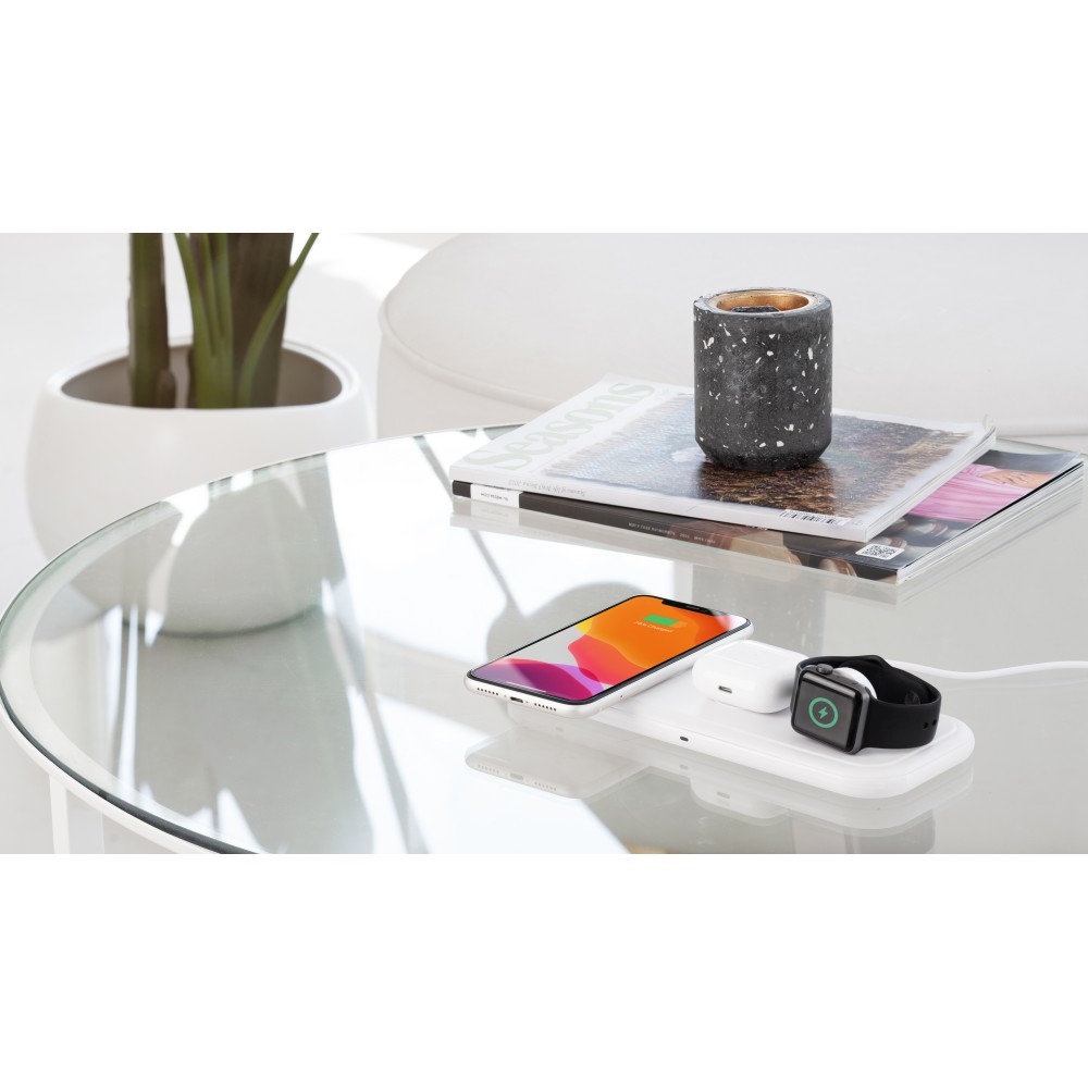 Быстрая беспроводная зарядная станция в белоснежном цвете с дополнительным функционалом - складным зарядным блоком для смарт-часов Apple Watch.
