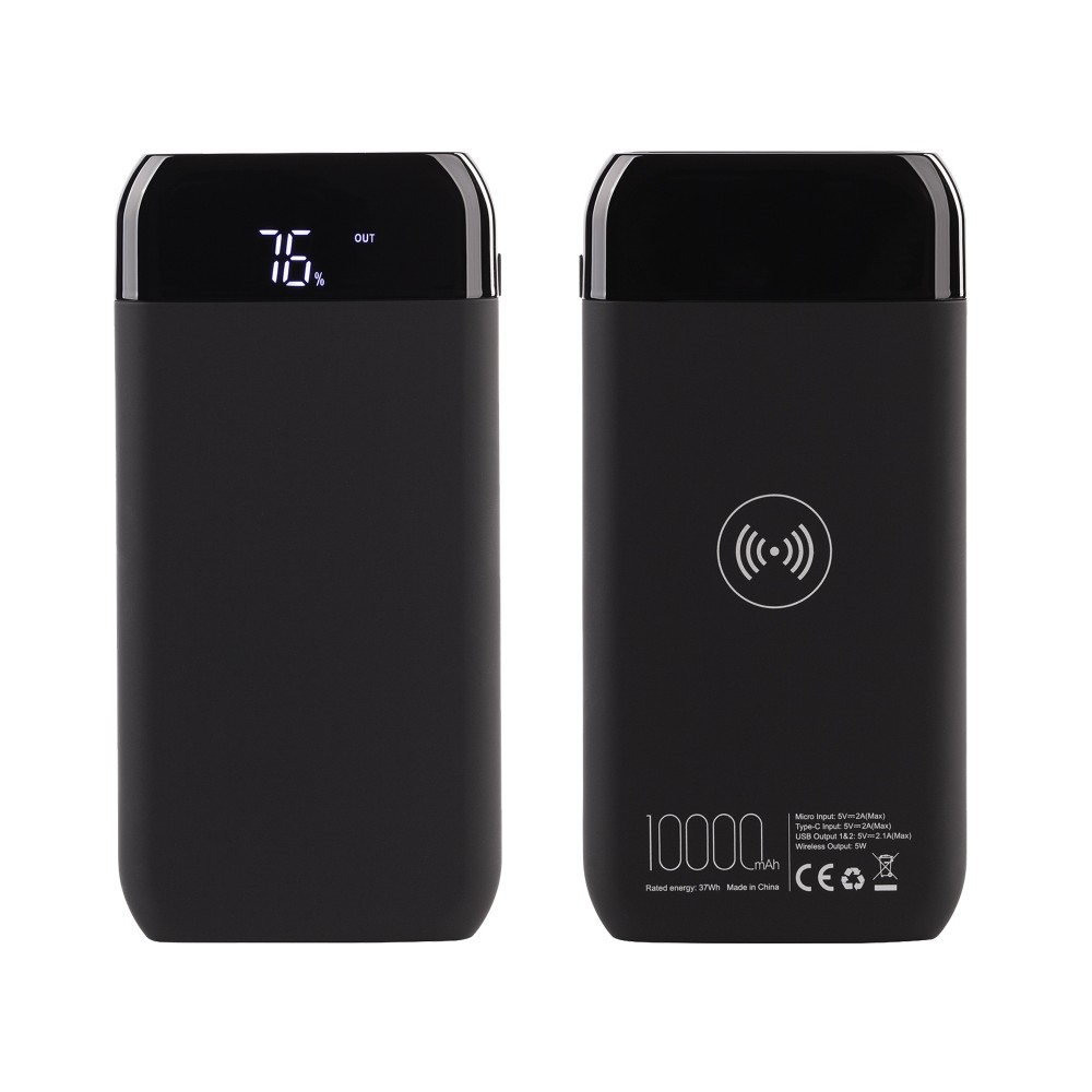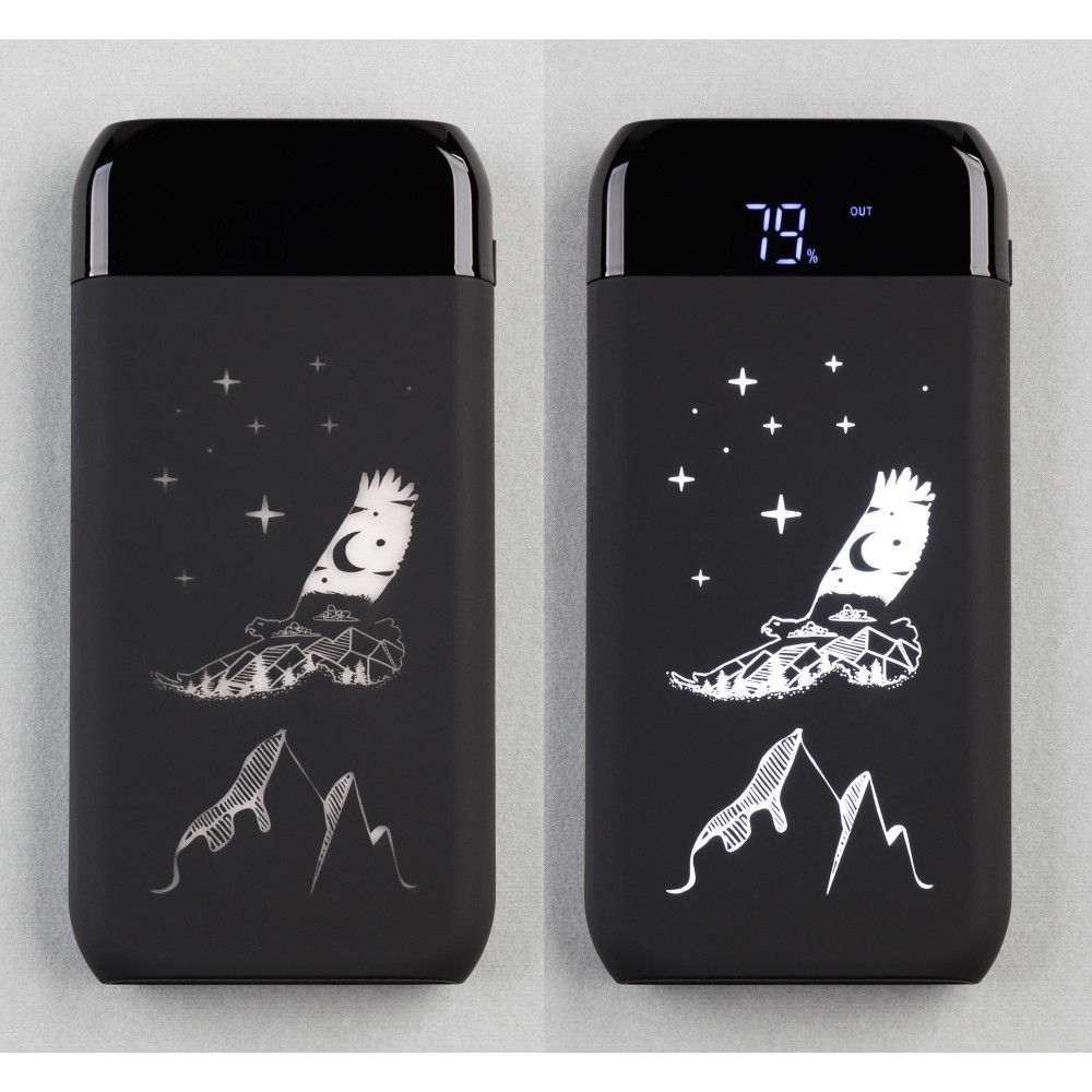 Успех модели обеспечивает сочетание хорошей ёмкости с актуальной функцией беспроводной зарядки и удобным (цифровым) отображением уровня заряда батареи. Эффектное дополнение - яркая персонализация в виде подсветки логотипа + приятный тактильно, бархатистый корпус в покрытии soft touch.