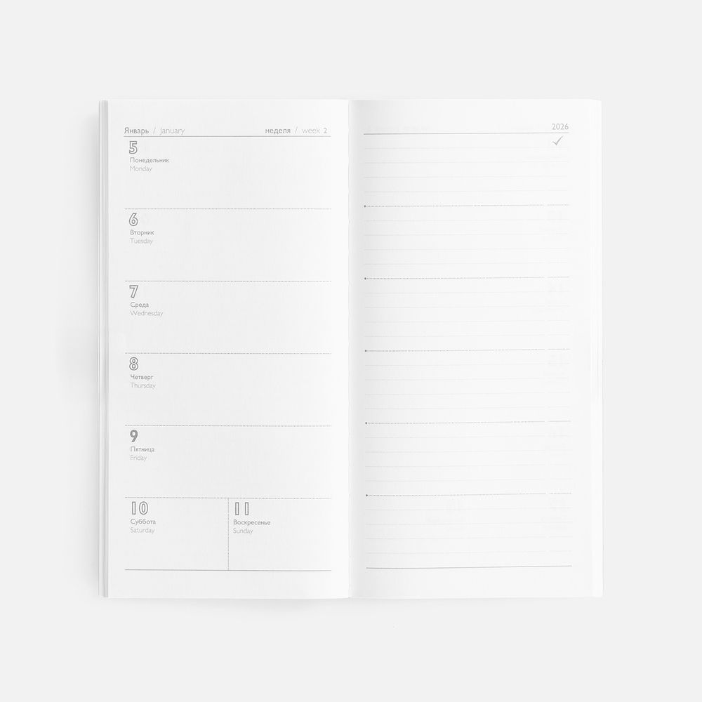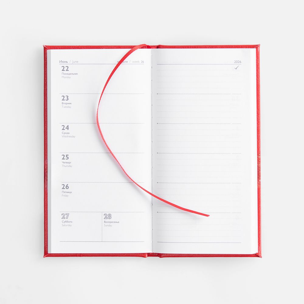 Еженедельник с твердой обложкой с поролоном из искусственной кожи, дополнен декоративной строчкой, капталом и ляссе в цвет.
