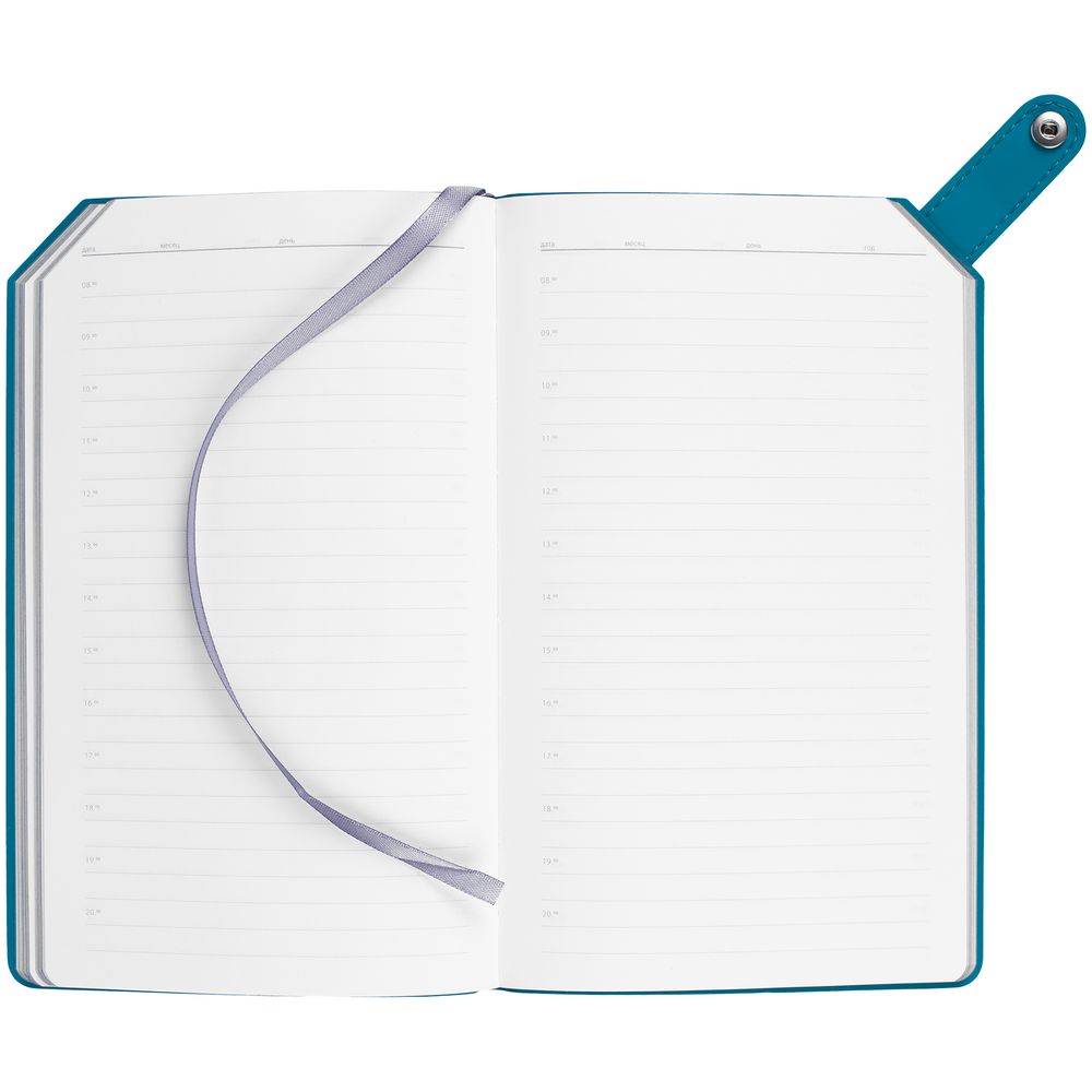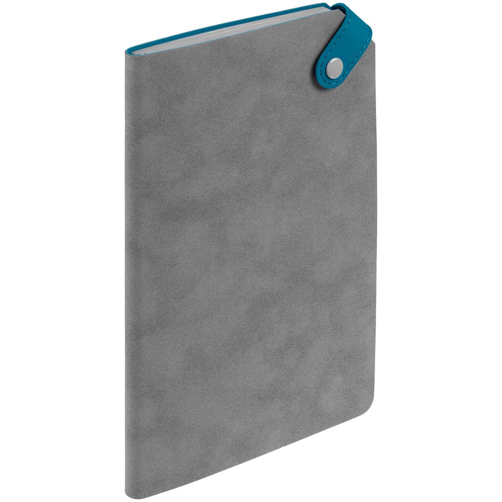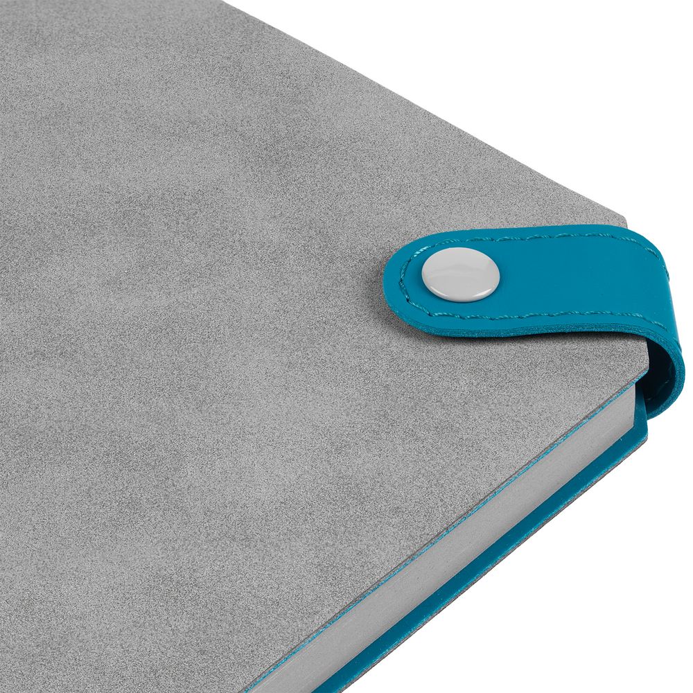 Ежедневник с гибкой обложкой, выполнен из материала Nubuck, серый СС и Soft Touch, морская волна II; дополнен серым ляссе и хлястиком на кнопке.