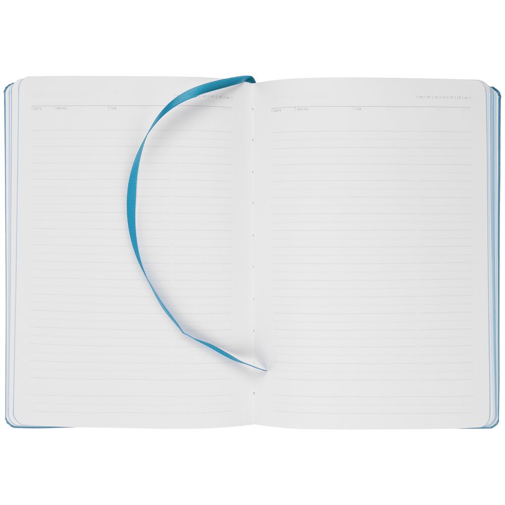 Ежедневник с твердой обложкой и тонированным обрезом. Выполнен из материала Latte, голубой, дополнен ляссе в цвет обложки.