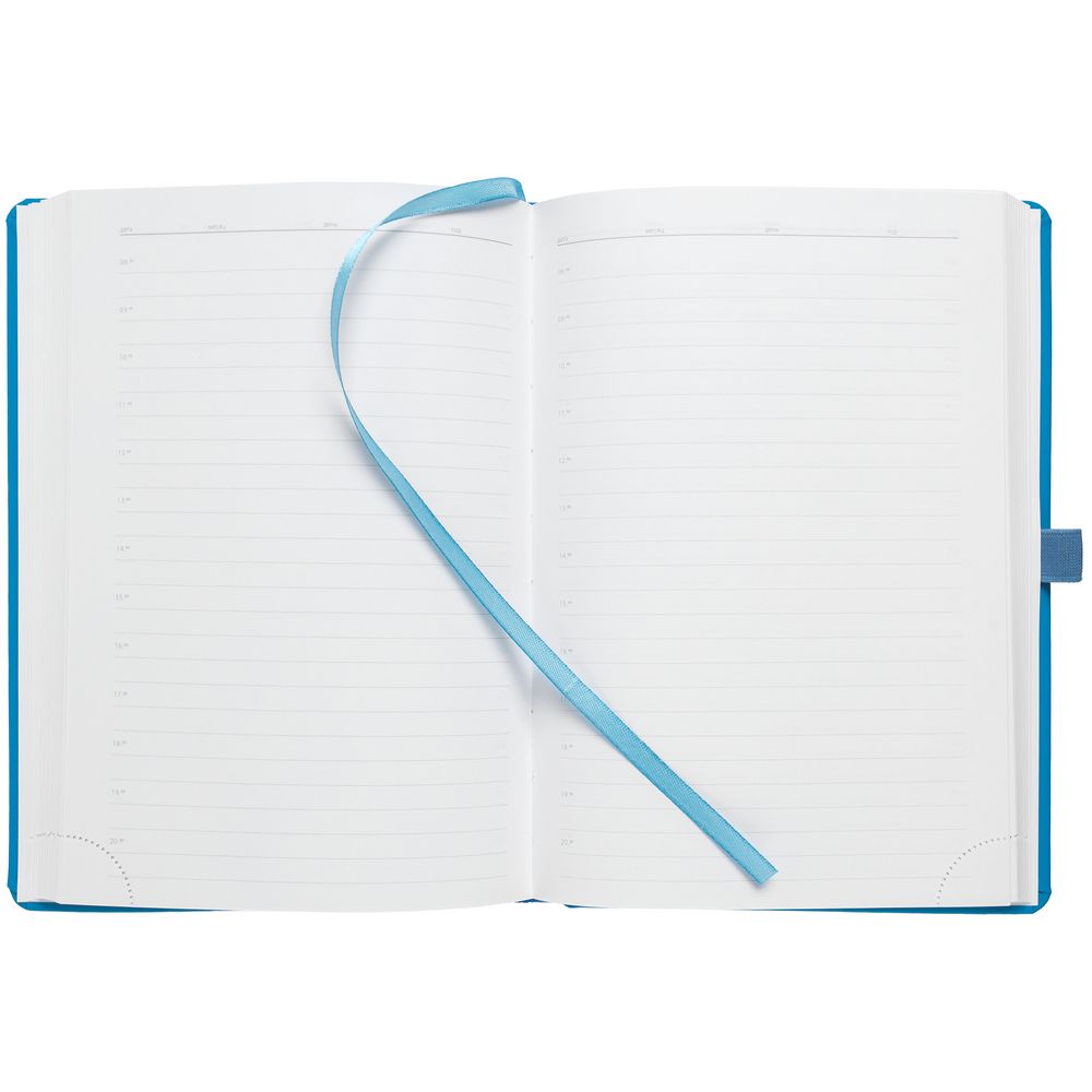 Ежедневник с твердой обложкой без поролона, выполнен из материала Soft Touch Ultra, голубой JJ, дополнен резинкой шириной 1 см, петлей-резинкой для ручки, капталом и ляссе голубого цвета.