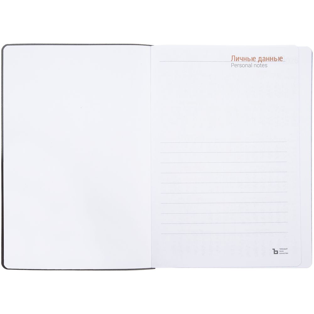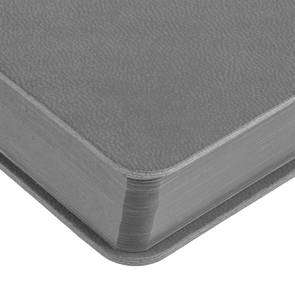 Гибкая обложка ежедневника выполнена из материала Latte, серый СС. Внутри корешка — специальное место для крепления ручки размером до 15х0,9 см.