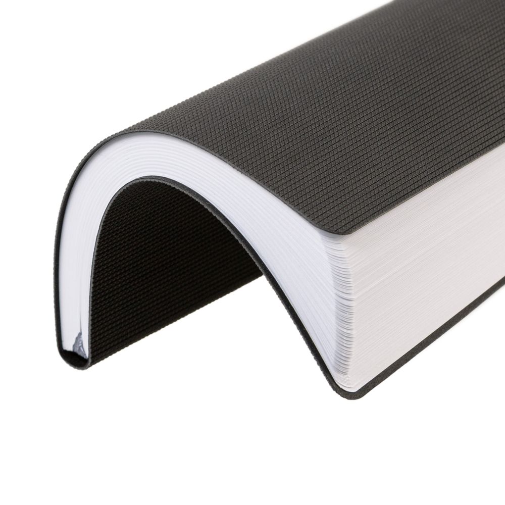 Ежедневник с гибкой обложкой, выполнен из материала Canyon, темно-серый ЕЕ, дополнен ляссе в цвет обложки. Блинтовое тиснение на обложке создает эффект вязаного полотна.