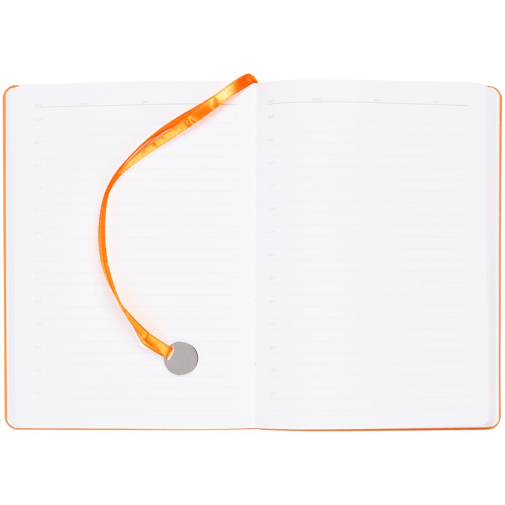 Ежедневник с гибкой обложкой, выполнен из материал La Fite, оранжевый ОО, дополнен ляссе в цвет обложки с металлическим шильдом.
