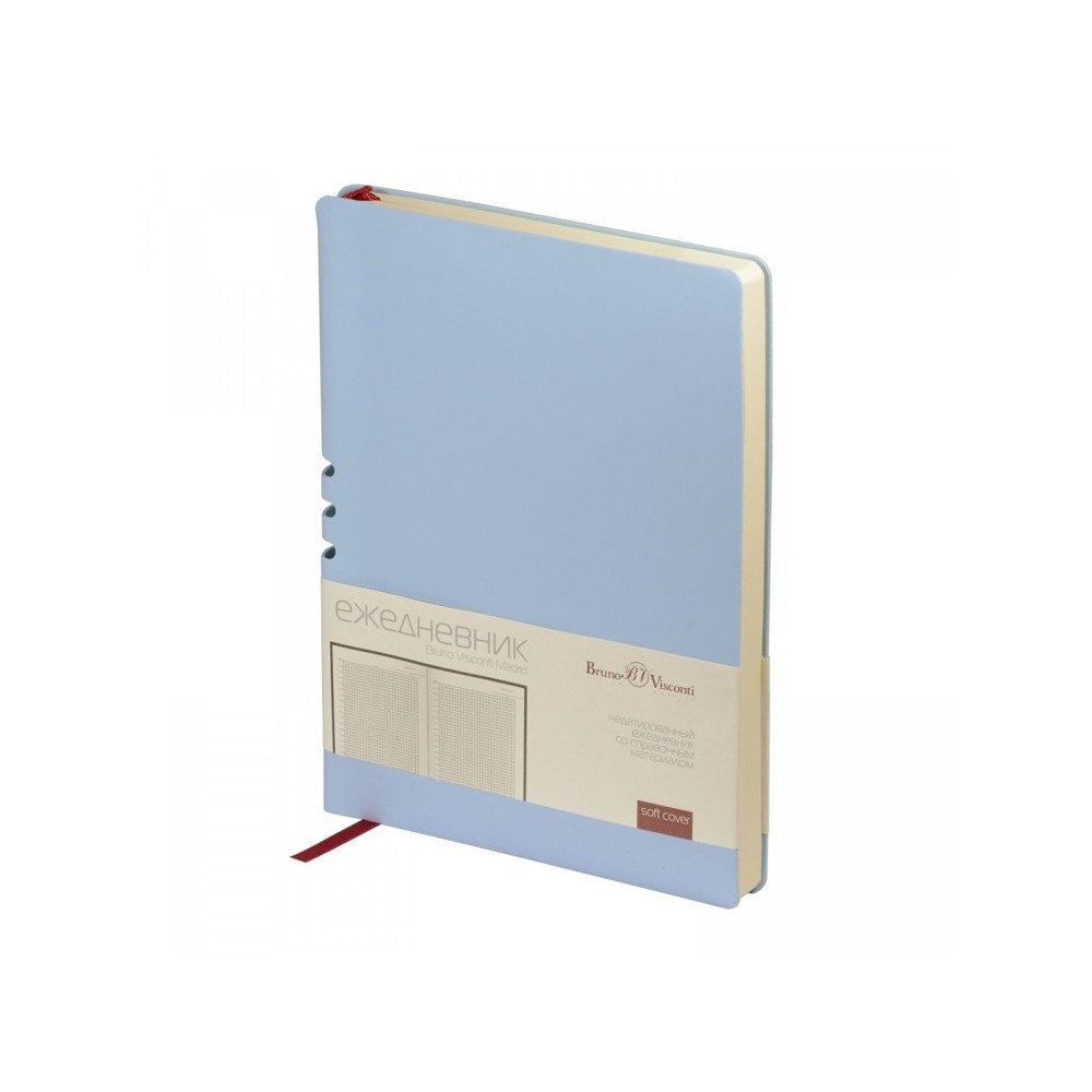Этот ежедневник вдохновлен солнечными днями и томными ночами Мадрида. И как этот великий город он лишь намекает снаружи на свои тайны. Так, вырубка на спинке – это удобная петля для ручки. Пользоваться этим секретом – одно удовольствие. Недатированный ежедневник Madrid от Bruno Visconti исполнен в модном зефирном голубом цвете. Гибкая обложка с покрытием Soft-Touch. Бордовое ляссе выгодно прекрасно сочетается со скругленной обложкой и бежевым блоком. Для изготовления данного ежедневника использована бумага плотность 70 г/м. Справочная информация на 17 страницах. Ежедневник упакован в картонный полукороб и термопленку.