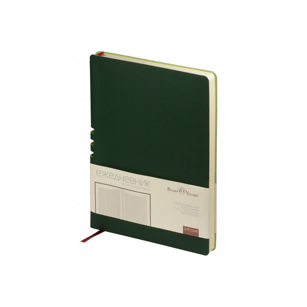 Этот ежедневник вдохновлен солнечными днями и томными ночами Мадрида. И как этот великий город он лишь намекает снаружи на свои тайны. Так, вырубка на спинке – это удобная петля для ручки. Пользоваться этим секретом – одно удовольствие. Недатированный ежедневник Madrid от Bruno Visconti исполнен в благородном зеленом цвете. Гибкая обложка с покрытием Soft-Touch. Бордовое ляссе выгодно прекрасно сочетается со скругленной обложкой и бежевым блоком. Для изготовления данного ежедневника использована бумага плотность 70 г/м. Справочная информация на 17 страницах. Ежедневник упакован в картонный полукороб и термопленку.
