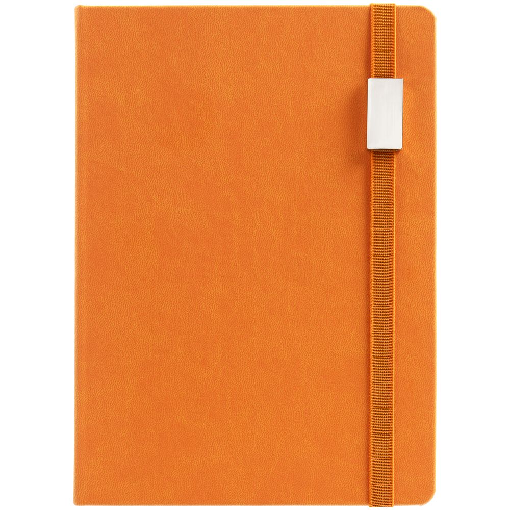 Ежедневник с твердой обложкой, выполнен из материала Latte, оранжевый ОО, обрез оранжевого цвета, дополнен ляссе оранжевого цвета и резинкой с металлическим шильдом.