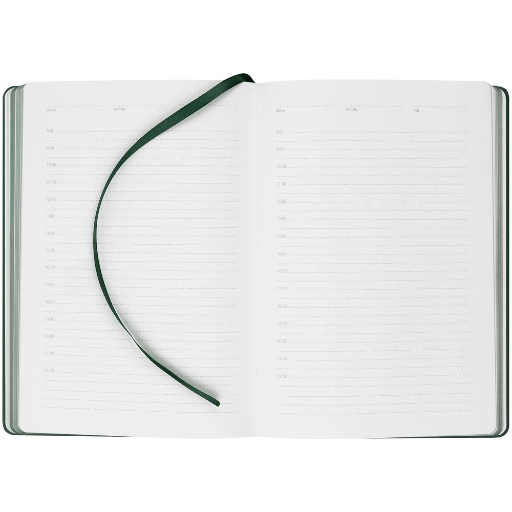 Ежедневник с твердой обложкой, выполнен из материала Latte, зеленый FF, обрез зеленого цвета, дополнен ляссе зеленого цвета и резинкой с металлическим шильдом.