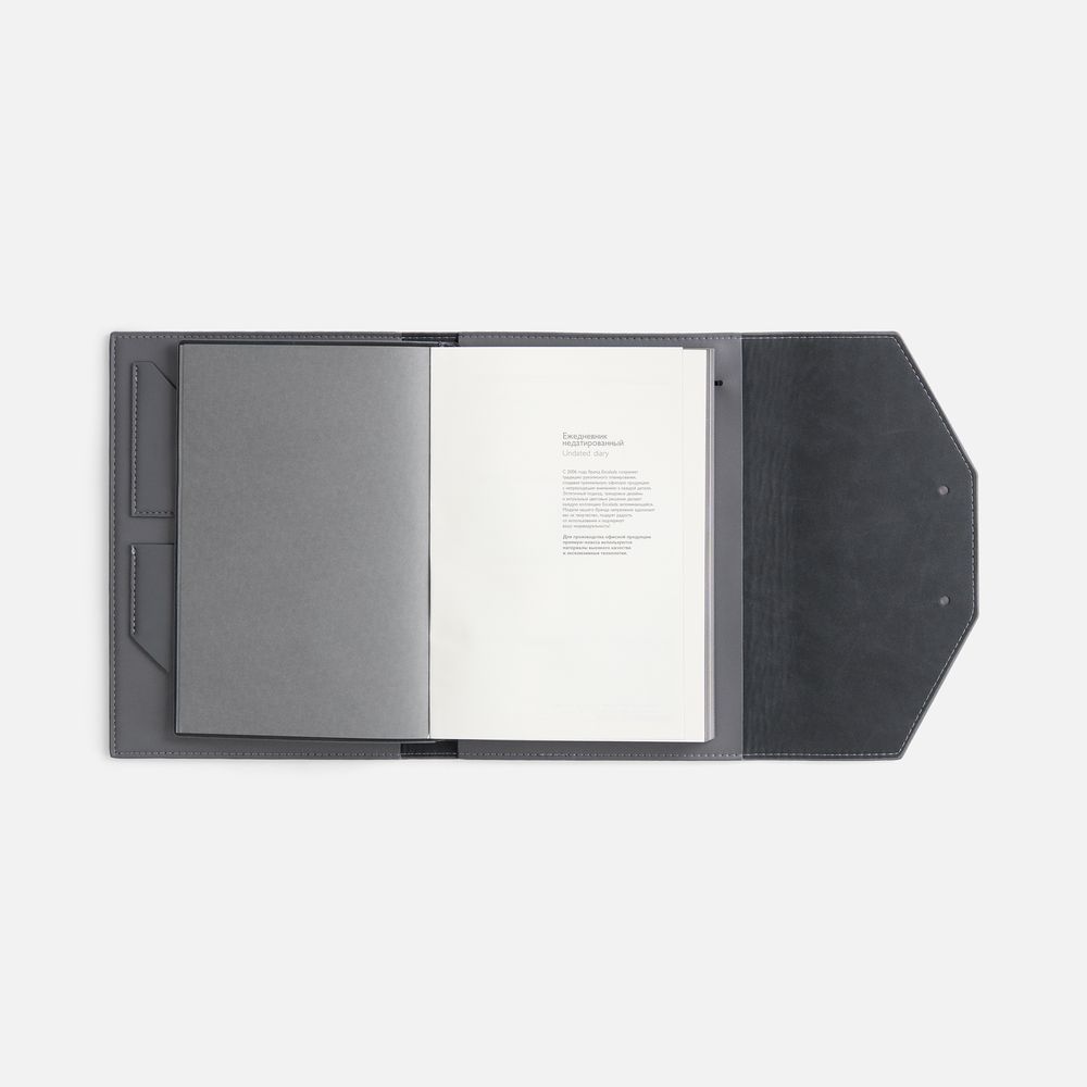 Ежедневник-органайзер в мягком переплете, формат А5+, с карманами для визиток и документов, петлей для ручки. Дополнен ляссе и капталом в цвет обложки. Клапан с прорезями застегивается на кобурные металлические кнопки.