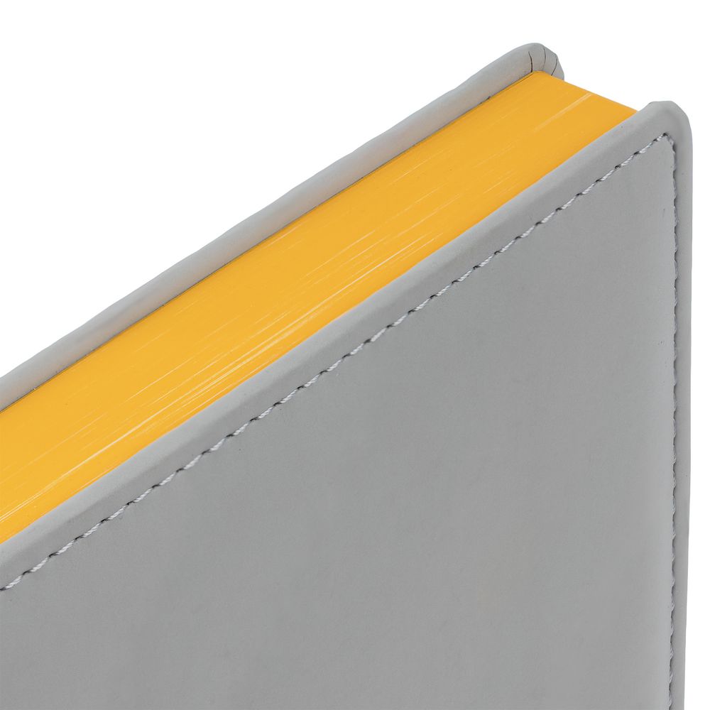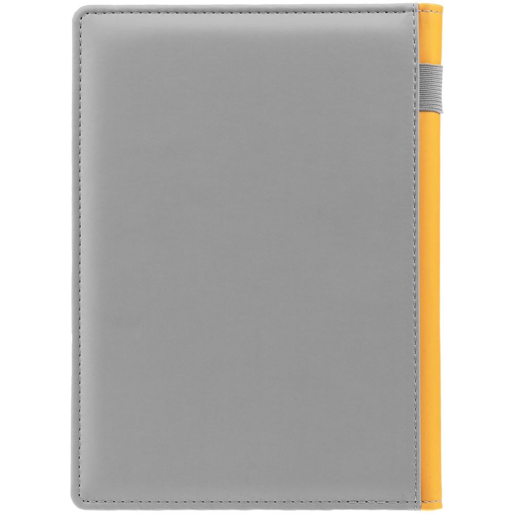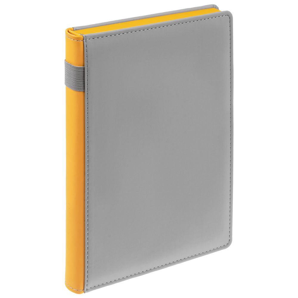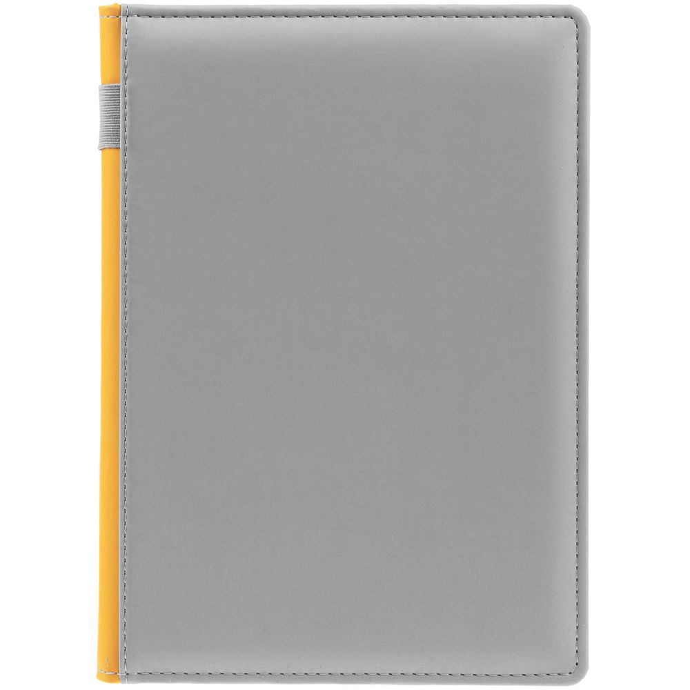 Твердая обложка с поролоном, материал обложки — Soft Touch, серый СС и Soft Touch, желтый КК. На корешке ежедневника находится петля из резинки.