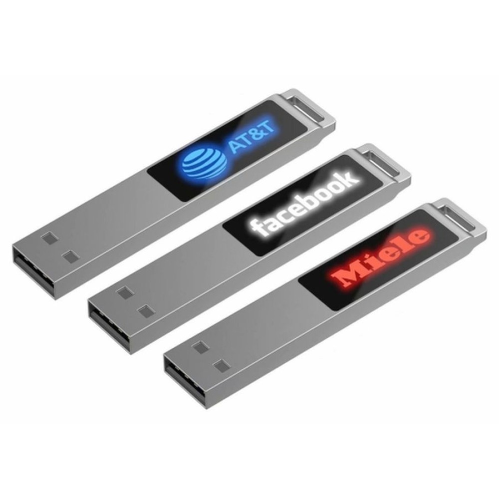 Флешка в тонком металлическом корпусе с пластиковой самоклеящейся шильдой в комплекте. Благодаря встроенной в корпус светодиодной матрице, логотип, выполненный на шильде методом лазерной гравировки, подсвечивается белым, красным, зеленым или синим в зависимости от выбранной модели.