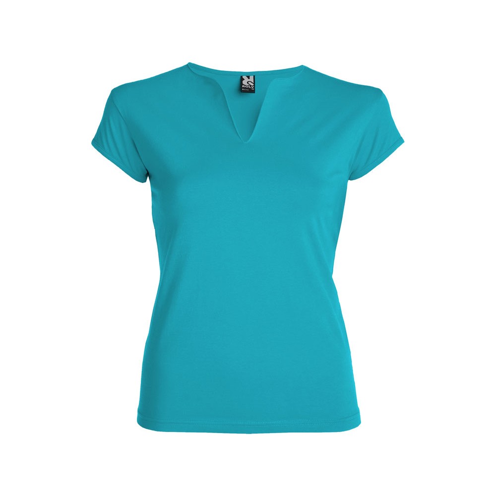 Приталенная женская футболка с круглым вырезом и v-образным разрезом спереди. Двойная отстрочка по рукавам и низу изделия.