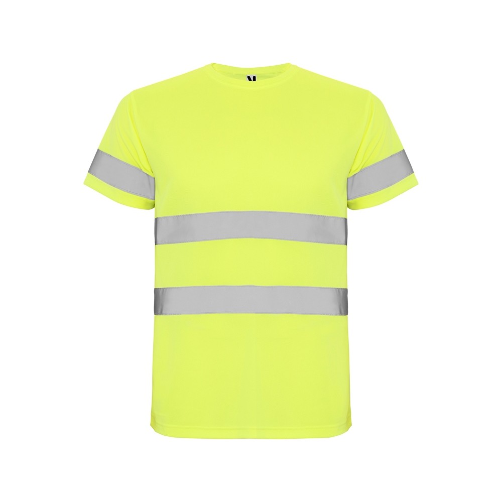 Футболка со светоотражающими элементами с короткими рукавами. Круглая горловина из той же ткани, с усиленными закрытыми швами на внутренней стороне горловины. Две горизонтальные светоотражающие полосы на туловище и одна светоотражающая полоса на рукавах.