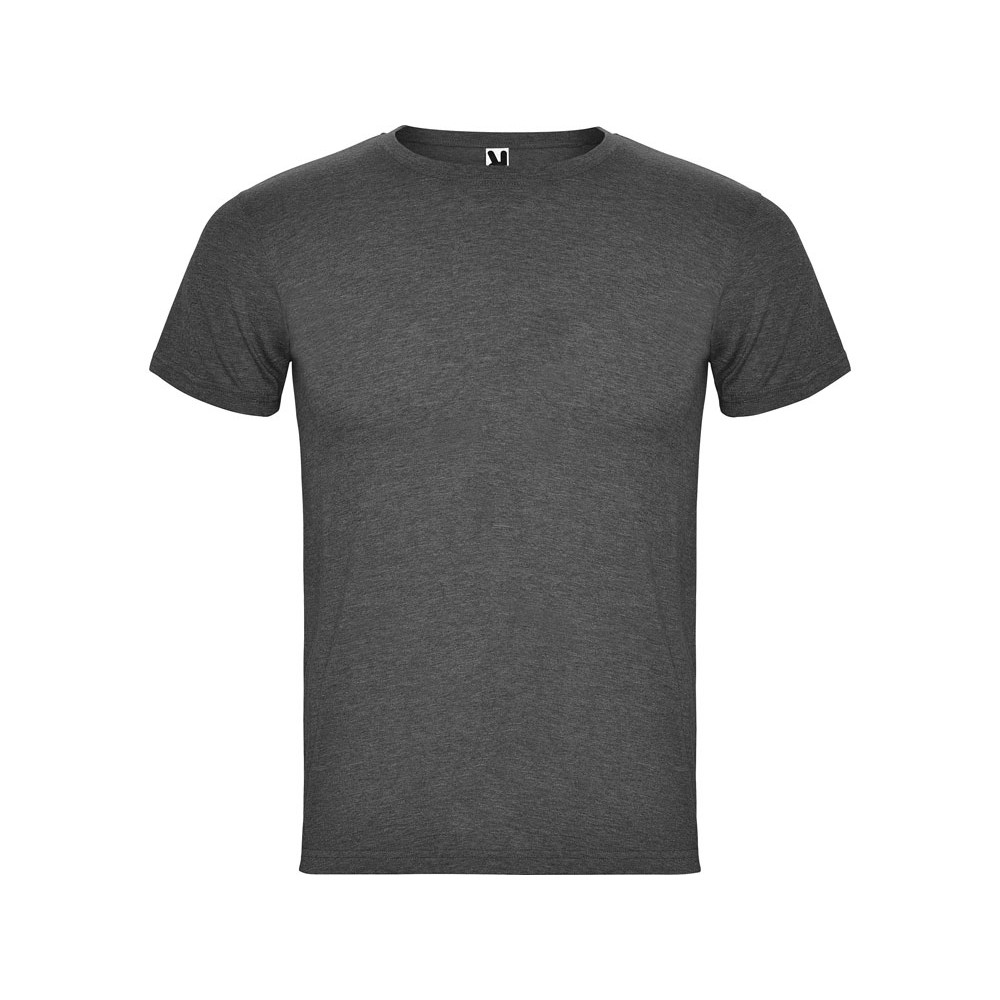 Футболка без боковых швов с коротким рукавом в меланжевом эффекте. Риб горловины 1х1 дополнительно укреплен двойной строчкой.