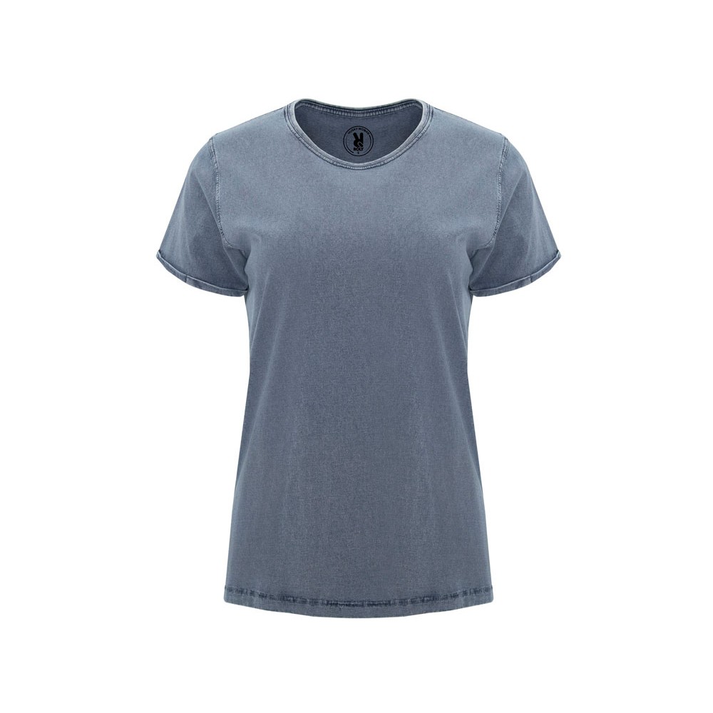 Женская футболка с джинсовым эффектом. Короткий рукав, горловина обработана рибом 1х1 и дополнительно укреплена тесьмой. Двойная отстрочка по пройме. Рукав с закручивающимся краем. В ассортименте также представлена аналогичная мужская модель Husky