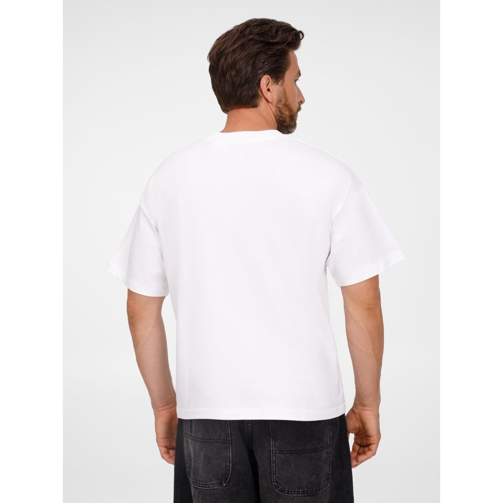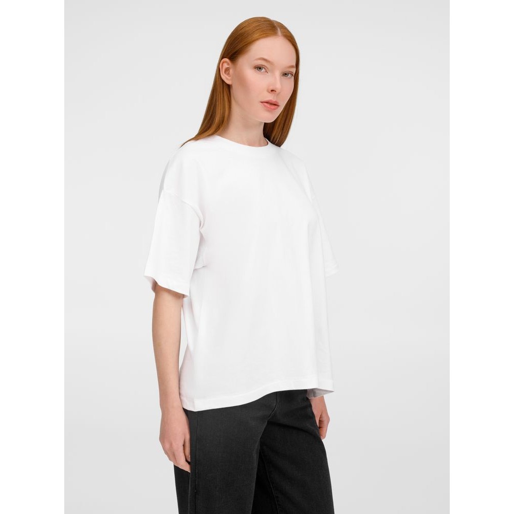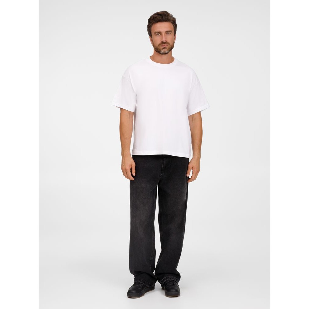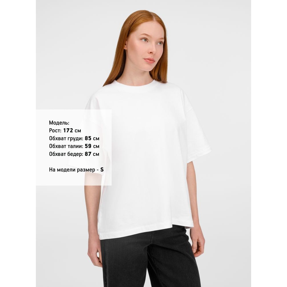 Футболка оверсайз унисекс с круглым вырезом и без боковых швов. Выполнена из смеси переработанного и обычного хлопка. Благодаря повышенной плотности отлично держит форму.