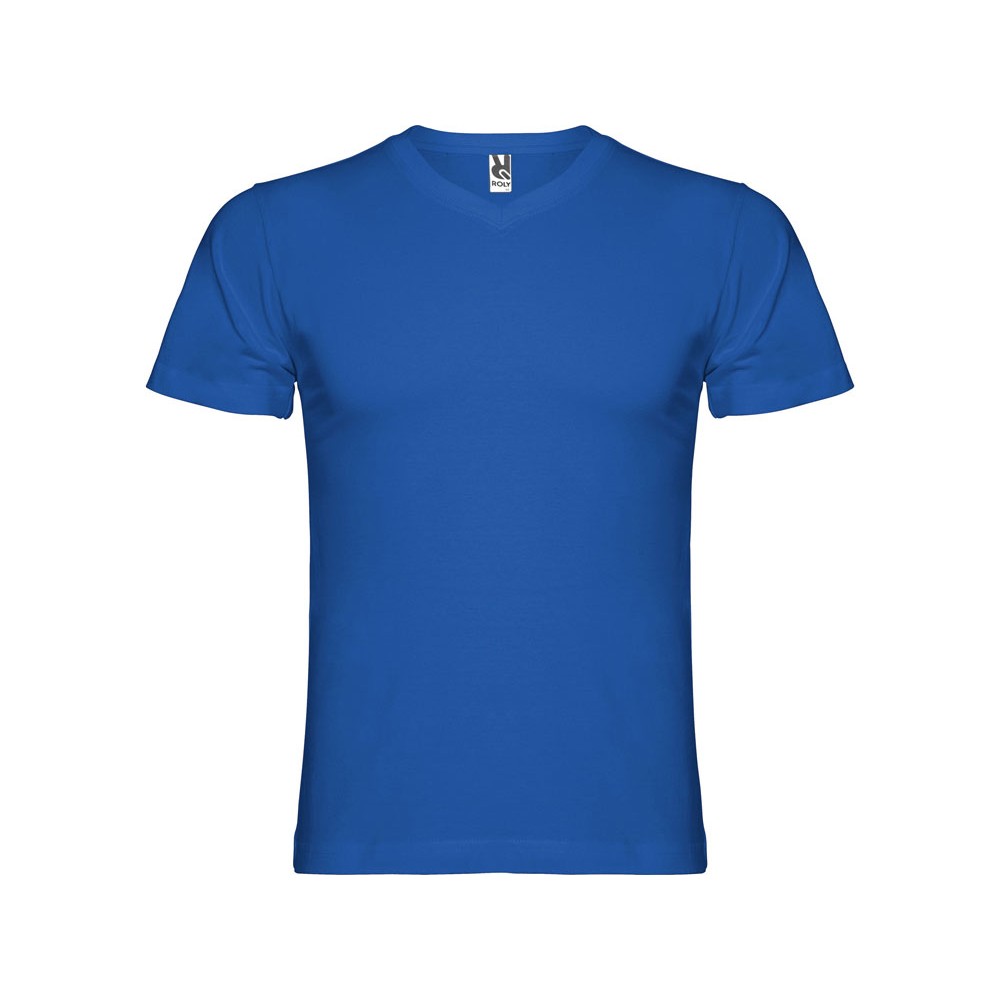 Мужская футболка без боковых швов с коротким рукавом и V-образным вырезом горловины, отделанном рибом 1х1. Горловина и плечевые швы дополнительно укреплены тесьмой.